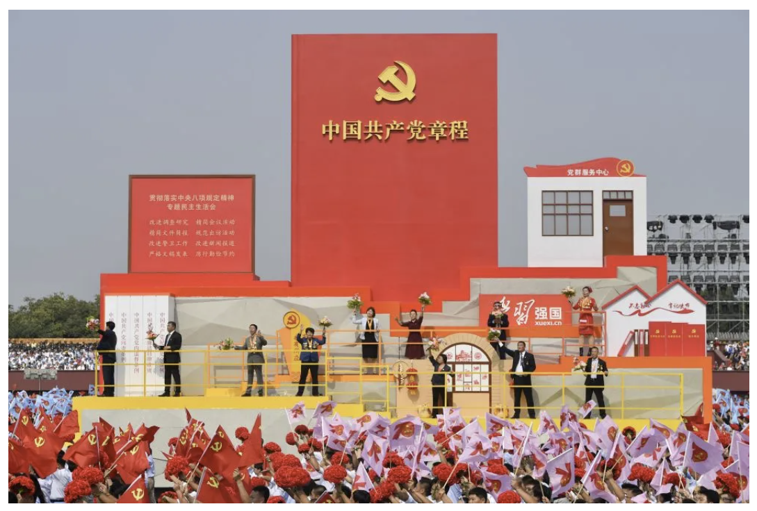 2019年10月1日上午,庆祝中华人民共和国成立70周年大会在北京天安门广场隆重举行。这是群众游行中的从严治党方阵。