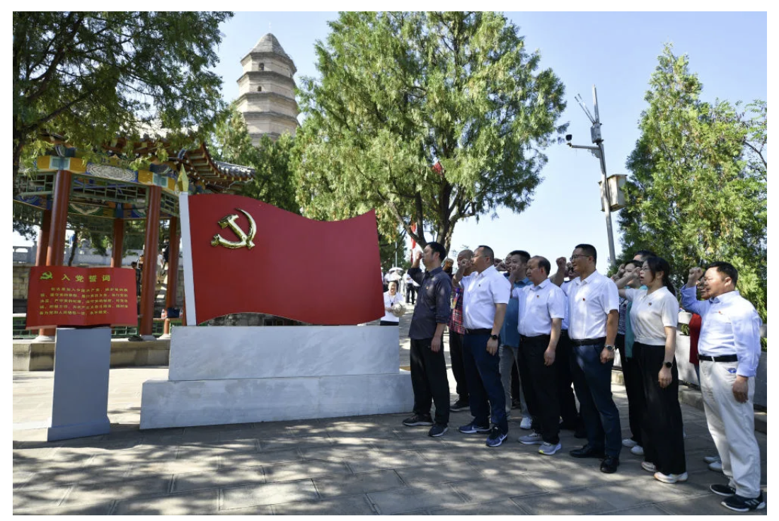 2023年6月30日,在延安宝塔山参观的党员干部重温入党誓词。