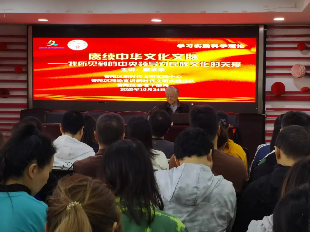 10月24日,普陀区理论宣讲新时代文明实践总队队员、区委普老宣讲团秦来来老师走进长寿路街道新时代文明实践分中心,为社区党员讲授《赓续中华文化文脉——我所见到的中央领导对民族文化的关爱》党课。秦老师结合自身经历,阐述习近平关于传统文化传承发展的理论,将思想与故事结合,从传统文化价值讲到中央关怀举措。党员认真聆听、积极互动,在轻松氛围中加深了对理论的理解,增强了文化认同感和自豪感。