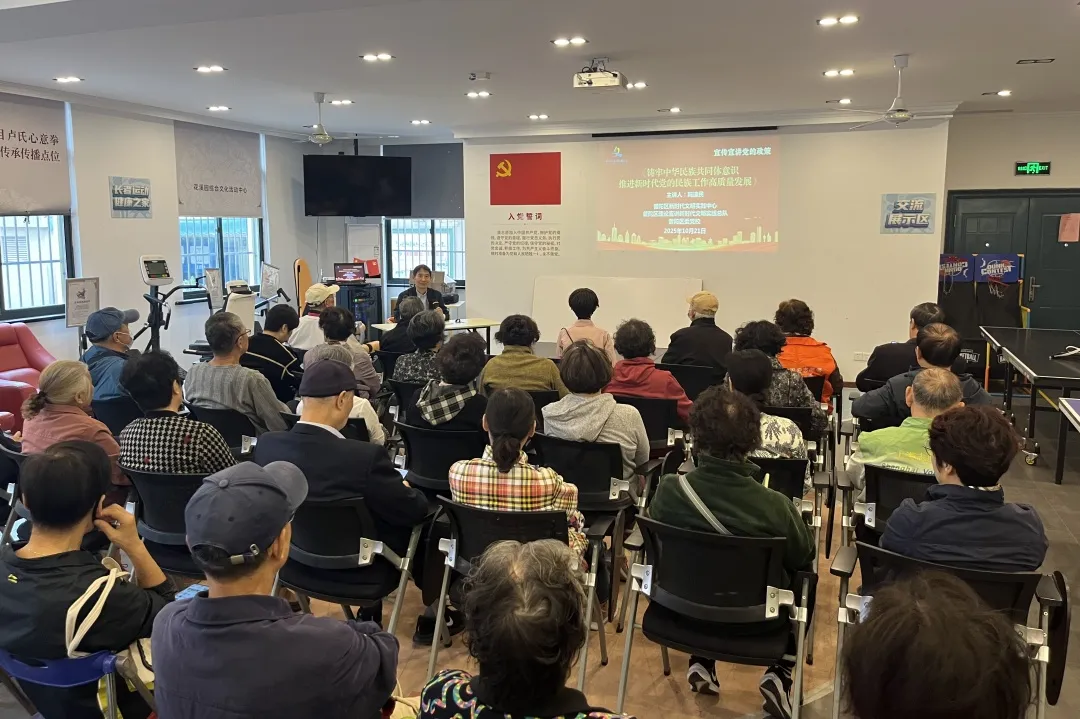 10月21日,普陀区理论宣讲新时代文明实践总队、区委党校陆迪民副教授走进曹杨新村街道新时代文明实践分中心,为社区退休党员讲授《铸牢中华民族共同体意识--推进新时代党的民族工作高质量发展》党课。课程聚焦共同体意识的核心内涵、重要意义,深入解读政策理论与鲜活案例,结合实际剖析民族工作高质量发展的路径举措,引导老党员领悟价值要求。陆教授强调以民族团结促社区治理,老党员们表示要发挥余热,助力社区民族团结进步。