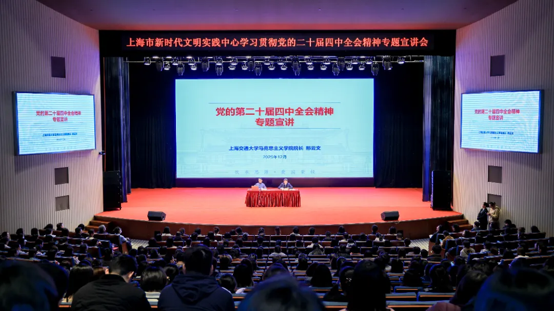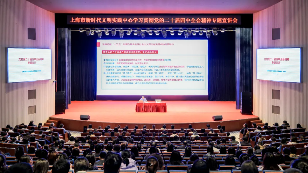 为深入学习贯彻党的二十届四中全会精神,进一步提升基层宣传队伍的理论水平,2025年12月8日下午,市精神文明办在浦东新区新时代文明实践中心举办上海市新时代文明实践中心学习贯彻党的二十届四中全会精神专题宣讲会,特邀上海交通大学马克思主义学院院长邢云文教授作专题宣讲。上海市精神文明办专职副主任冯芳出席会议并主持。各区精神文明办相关负责人、新时代文明实践中心(分中心)的宣传骨干、新时代文明实践理论宣讲品牌团队的成员,以及文明单位的宣传工作者代表等近400人参加会议。