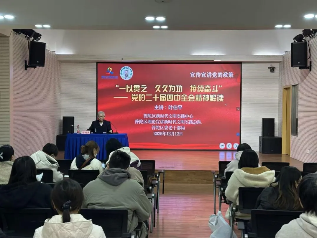 12月12日,普陀区理论宣讲新时代文明实践总队队员、区委普老宣讲团团长叶伯平老师走进长征镇新时代文明实践分中心,为社区党员及群众讲授《“一以贯之 久久为功 接续奋斗”—— 党的二十届四中全会精神解读》党课。叶老师立足核心要义,系统梳理全会十二项重要部署、十三大显著优势及治理现代化“三步走”目标,逻辑清晰、重点突出。他还结合基层实际,把与群众生活紧密相关的政策要点讲得通俗易懂。课后,党员们深受触动,老党员称党课如及时雨,让其看到理论在生活里的体现,定将继续为社区出力。