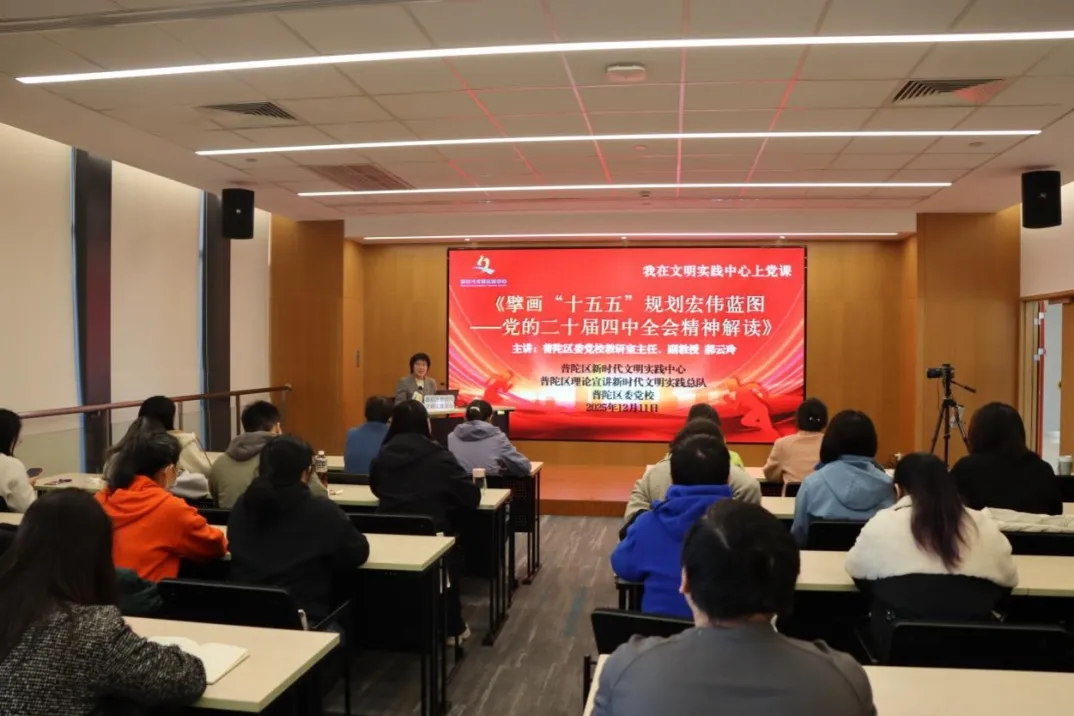 12月11日,普陀区理论宣讲新时代文明实践总队队员、区委党校教研室主任、副教授郝云玲在普陀区新时代文明实践中心为社区党员开展《擘画“十五五”规划宏伟蓝图——党的二十届四中全会精神解读》党课。郝教授围绕《建议》框架,从重大意义、核心要义、亮点及实践路径等方面,对全会精神作全面系统阐释。宣讲理论与实际结合,内容主次分明、形式多样,还结合习近平总书记考察上海重要讲话精神、“十五五”发展目标以及普陀区发展实际开展案例教学,为党员干部领会全会精神提供有力指引。党员们表示:通过此次学习,对党的二十届四中全会精神有了更深刻理解,今后将为普陀建设“协同创新活力区、半马苏河品质区”做出更多贡献。