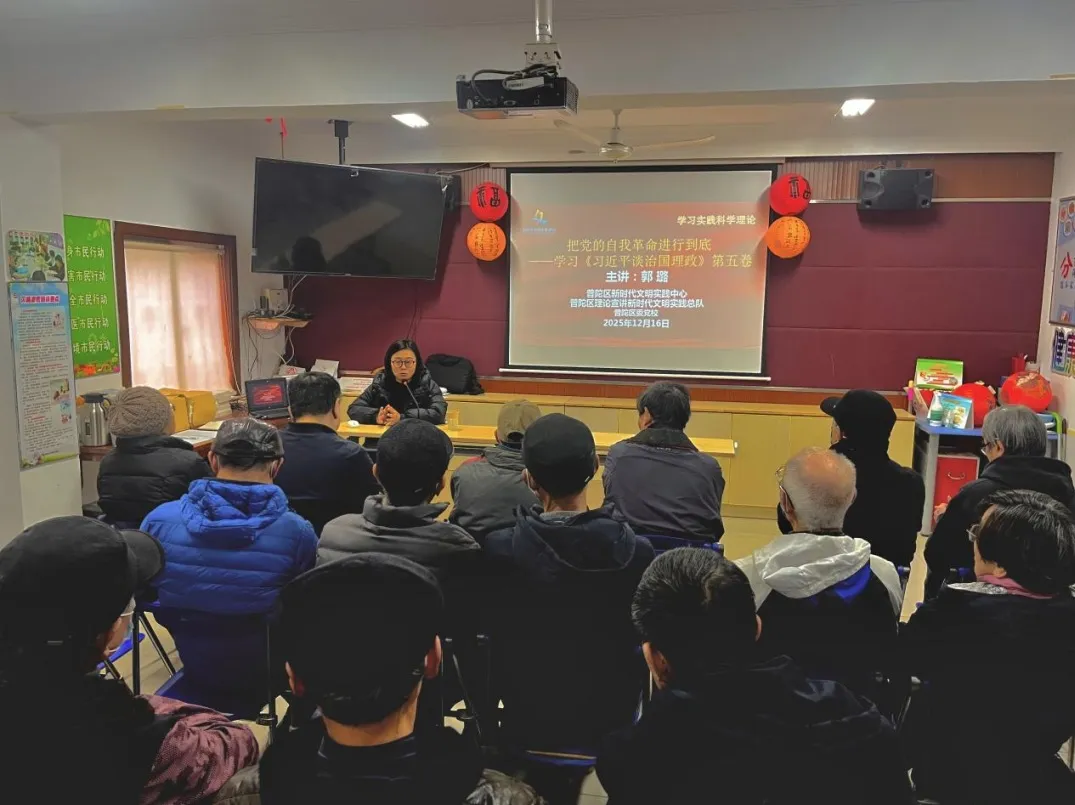 12月16日,普陀区理论宣讲新时代文明实践总队队员、区委党校调研室讲师郭璐老师走进曹杨新村街道桂杨园居民区新时代文明实践站,为社区党员讲授“把党的自我革命进行到底”——学习《习近平谈治国理政》第五卷党课。课程紧扣书关于党的自我革命的重要论述,深入剖析其核心要义、精神实质与实践要求,阐明推进党的自我革命对新时代党的建设的重大意义。郭老师结合理论与实际,梳理出践行党的自我革命的路径方法,助力听众深刻领悟内涵,将学习成果转化为提升思想、推动工作的动力。社区党员老张:“作为一名社区老党员,今后不仅要自己做到‘退休不褪色’,更要带动年轻党员做好自我提升。”