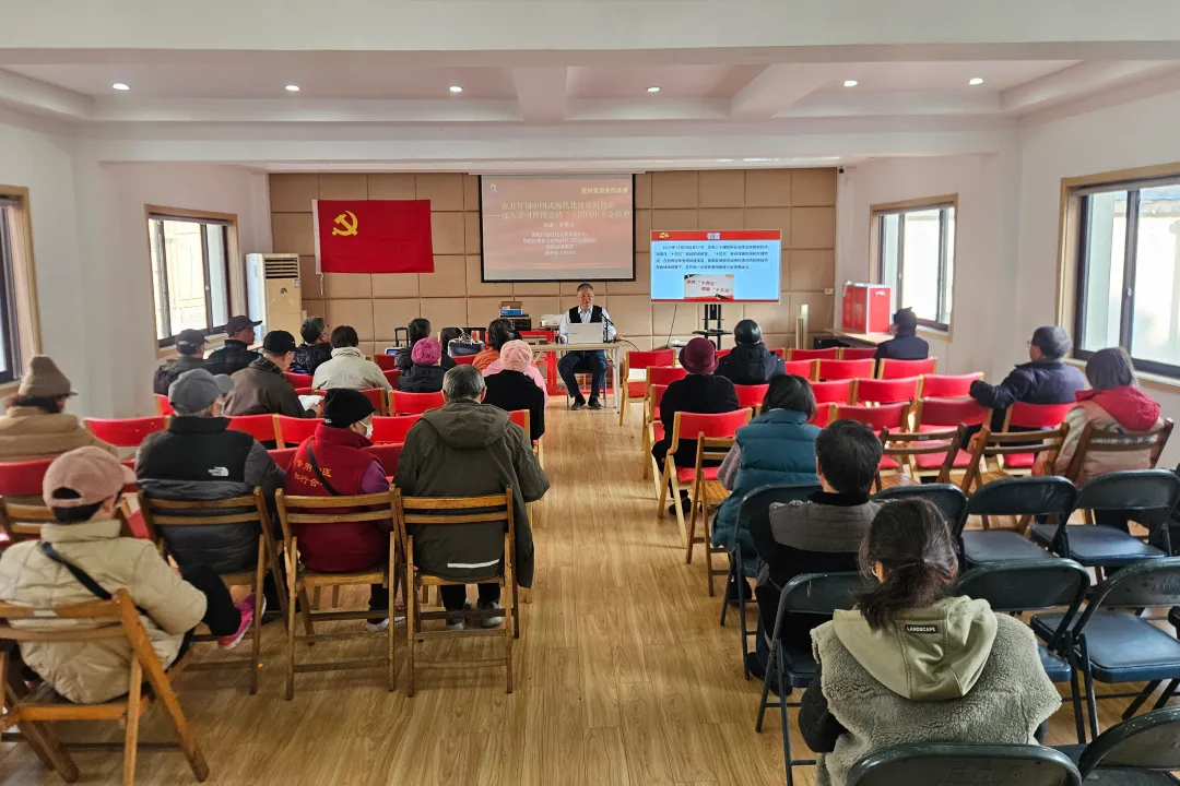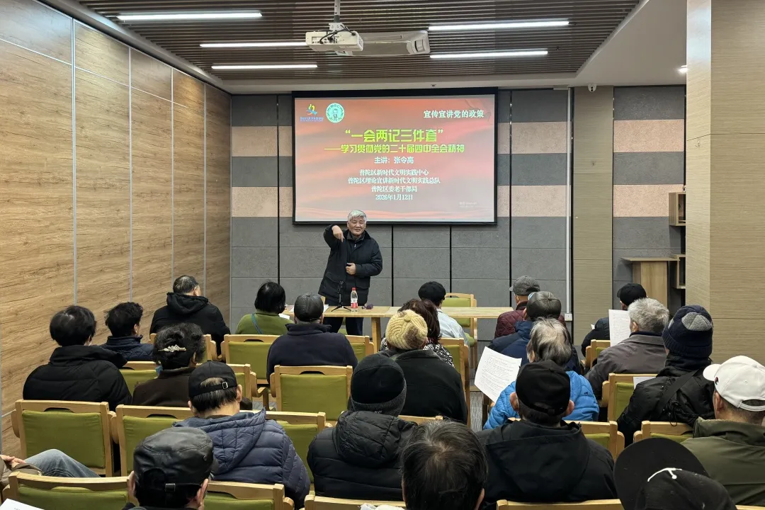 1月12日,普陀区理论宣讲新时代文明实践总队队员、区委普老宣讲团成员张令高在甘泉路街道新时代文明实践分中心为社区党员及群众带来《“一会两记三件套”——学习贯彻党的二十届四中全会精神》党课。张老师紧扣二十届四中全会精神,以“十五五”规划为脉络,聚焦“中国式现代化”“全过程人民民主”“共同富裕”三大关键词,结合社区养老、老旧小区改造等民生案例,拆解“七个聚焦”“六个坚持”核心要求。通过“一会(全会精神)—两记(理论+案例)—三件套(解读+问答+行动指南)”模式,将国家战略转化为基层治理“任务书”,明确党员群众在今后工作中的责任路径。党员小李感慨:“我们党员既要做好政策宣传的‘扬声器’,更要当好文明行动的‘火种’!”