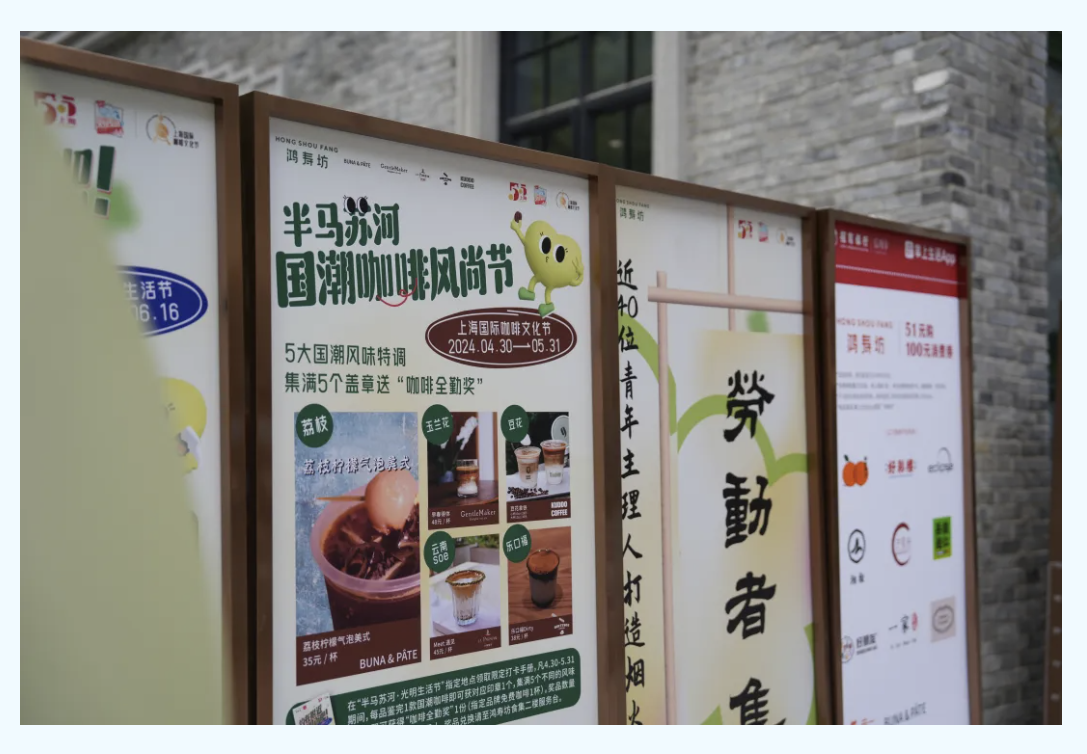值得一提的是 ,由普陀区文旅局指导,鸿寿坊推出的半马苏河国潮咖啡风尚节也在上海国际咖啡文化节期间同步举办。现场汇集了商场5家咖啡品牌,推出了各具特色的国潮咖啡饮品。从拿铁、美式,到特调咖啡,每一款都让人回味无穷。市民还可参加商场举办的集卡活动:集满5个章送1杯咖啡和丢沙包赢免费咖啡。