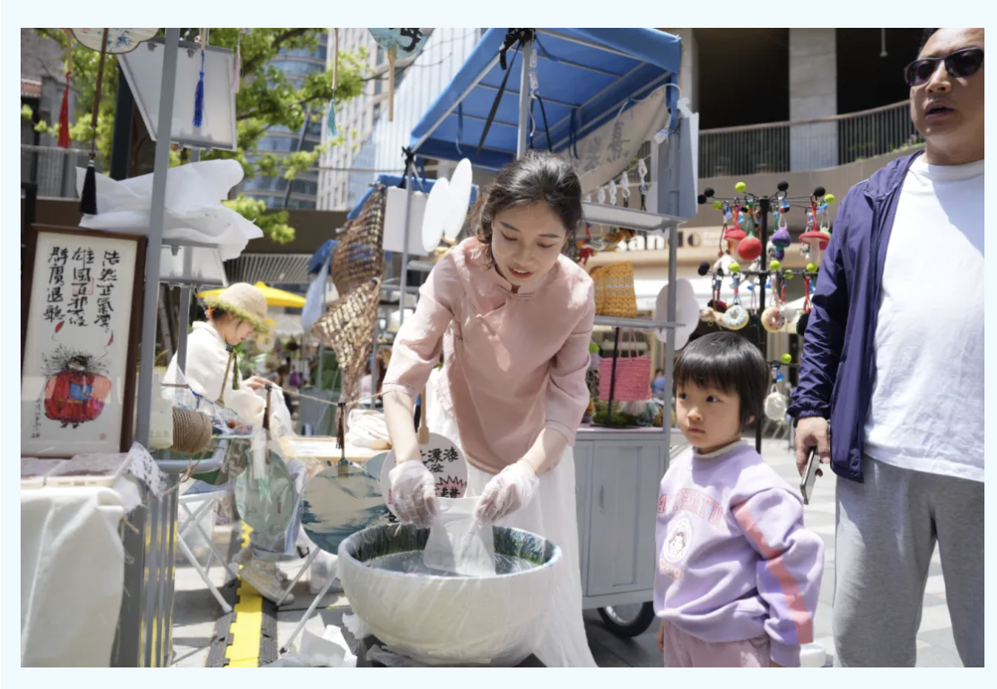 市民们穿梭在市集之间,欣赏着精美的手工艺品,感受着传统文化的魅力。数十个非遗文化体验摊位前,其中一项以颜料依附在水面作画的非遗体验漂漆吸引了不少市民驻足,大家对颜料滴在水面、印在扇上的技艺赞叹不已。