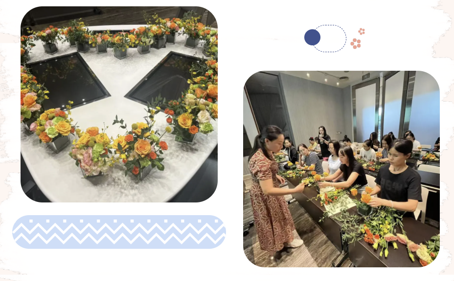 秋风送爽,秋意盎然,用一场时令花艺,带来美好午后时光。花艺老师现场讲解鲜花层次搭配与技巧,暖洋洋的橘色、明媚的黄色是秋天的代表色彩,无论是日常瓶插还是花束,秋意氛围感满满。鲜花的芬芳让我们近距离感知秋的浪漫,亲手制作一盆花能令人眼前一亮,让办公时间焕发一周活力。