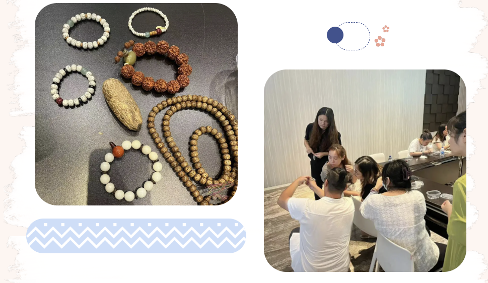 一颗颗菩提子,如何变身为手腕上精美的手串呢?一边解读菩提的寓意和品种,一边教授如何分辨菩提子品相。例如星月菩提打磨后中间有芽眼,芽眼周围均匀分布黑点,如众星捧月。制作手串需要些许耐心,老师边说边动手示范,细选每一颗菩提子,圆润触感在指腹间划过。巧手穿线,珠珠相连,美观大方,易于搭配。或作为自己佩戴,或是赠与他人当作礼物,都不失为一份美好的寄愿。