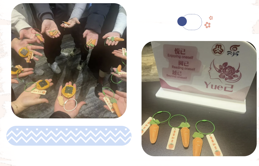 老师给大家准备了材料包,指导讲解了皮具手工的制作步骤,并逐步示范制作。在“皮具挂饰”小作坊,裁皮、粘合、打孔,大家展露着自己的干练,一起感受拼搭的乐趣。一块块配件在手中变成了一个独特精致的挂件,制出一件件精致小巧充满趣味的萝卜、柿子挂饰。