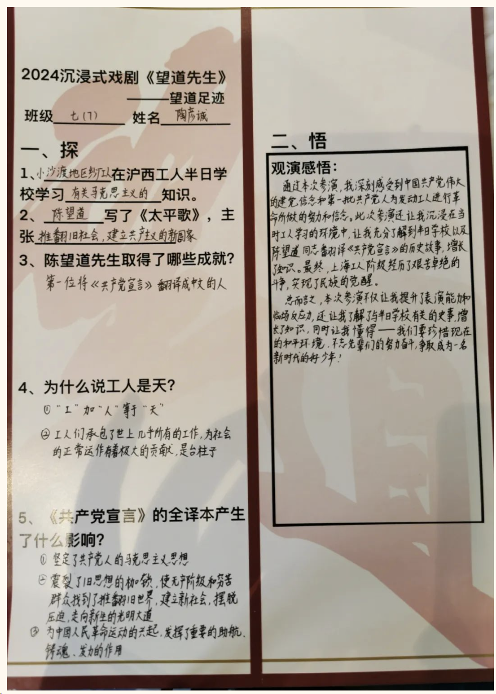 这次沉浸式戏剧《望道先生》使我们了解到了旧社会工人的生活,工作与学习,也让我们明白了工人力量在革命中的重要性。半日学校和陈望道先生翻译的《共产党宣言》,都对共产党在中国宣扬马克思主义做出了重大的贡献。参与这次活动另外一个额外收获是让我们更加了解了话剧表演的技巧与知识。