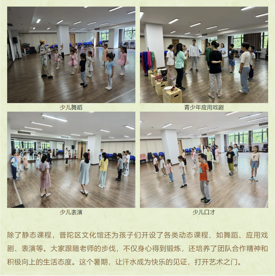 除了静态课程,普陀区文化馆还为孩子们开设了各类动态课程、如舞蹈、应用戏剧、表演等。大家跟随老师的步伐,不仅身心得到锻炼,还培养了团队合作精神和积极向上的生活态度。这个暑期,让汗水成为快乐的见证,打开艺术之门。