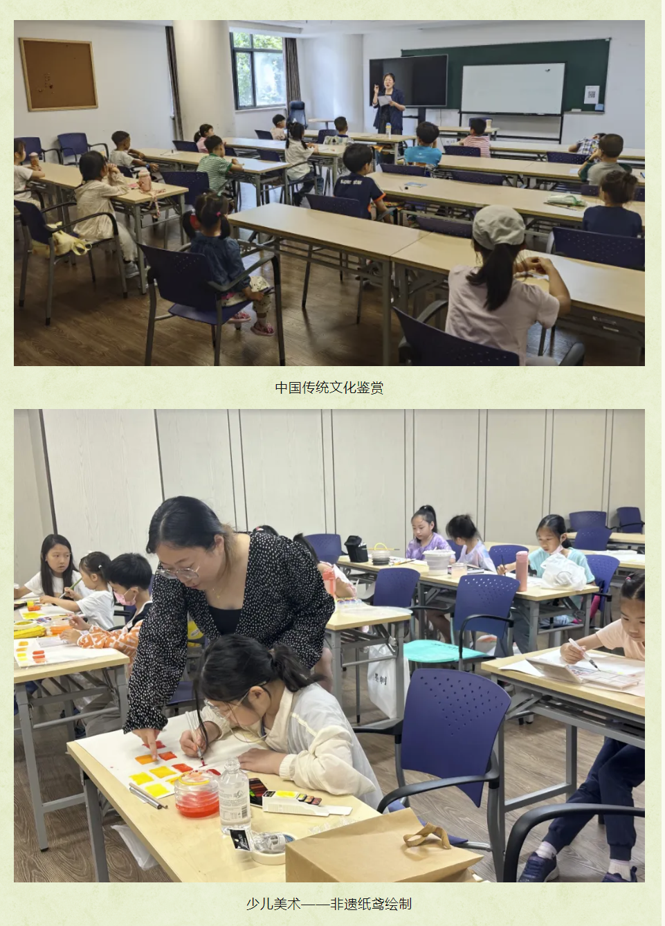 为了增强孩子们对传统文化的感知,普陀区文化馆本次新开设了中国传统文化鉴赏和少儿美术——非遗纸鸢绘制课程。在中国传统文化鉴赏课上,老师带领孩子们品读四大名著,畅游古今,穿越时空的长廊,感受中华文化的博大精深。在少儿美术——非遗纸鸢绘制课上,孩子们舞弄水彩,体会颜料和色彩的神奇变化,激发创作热情。