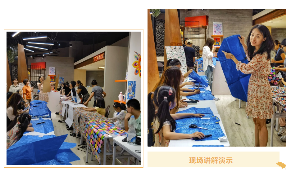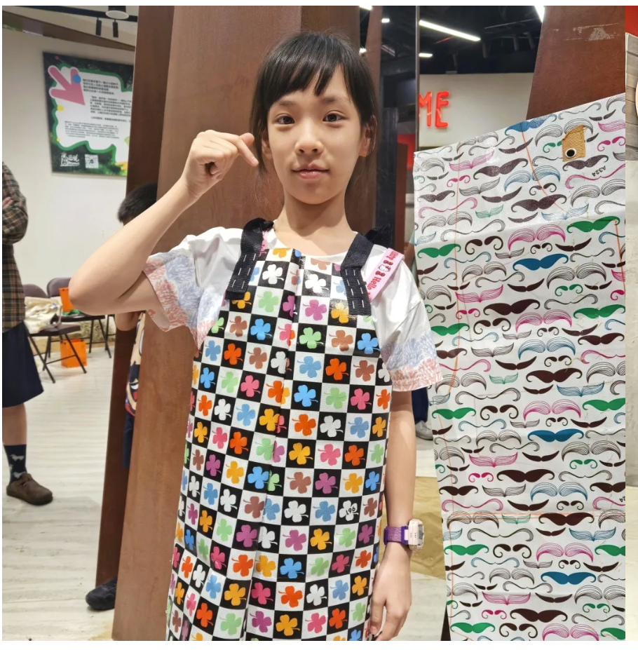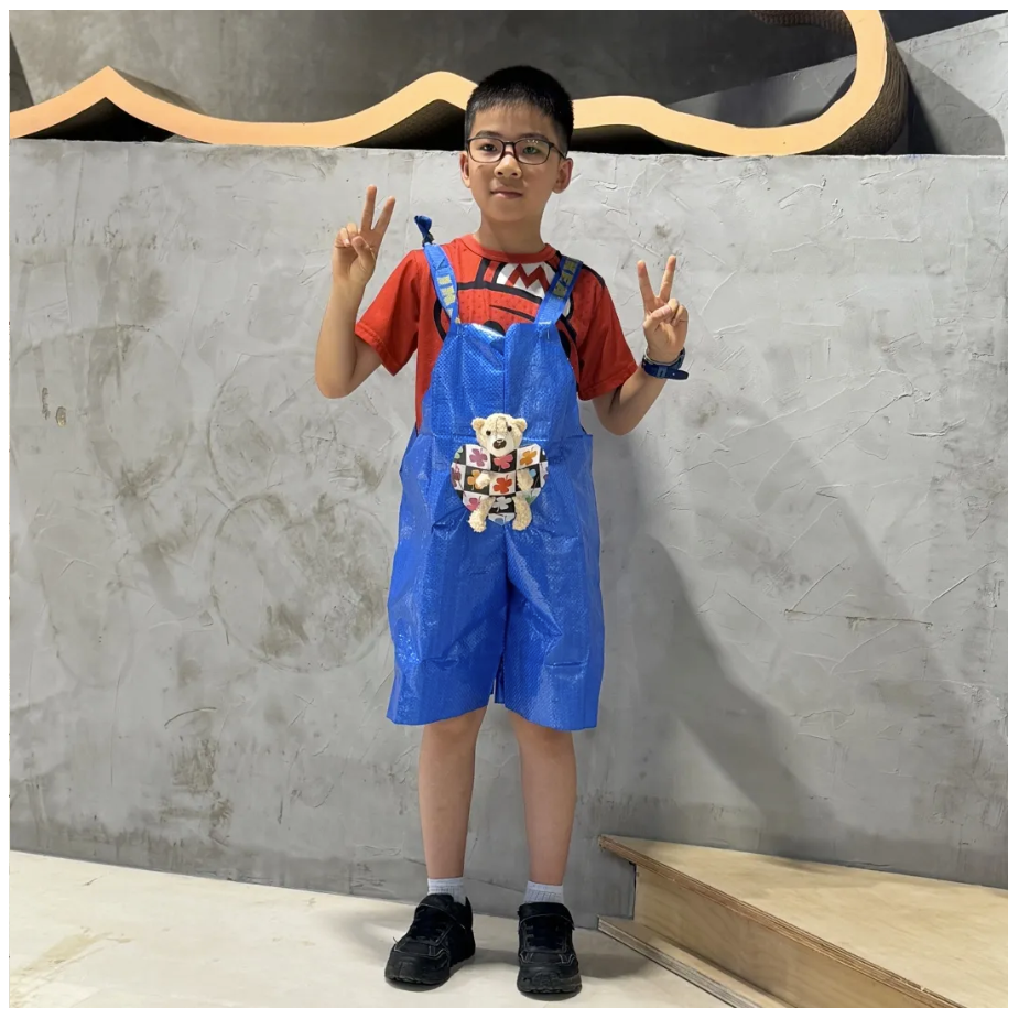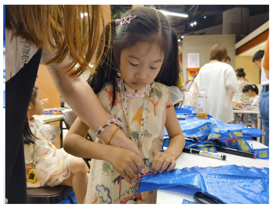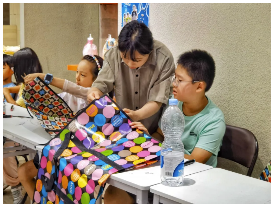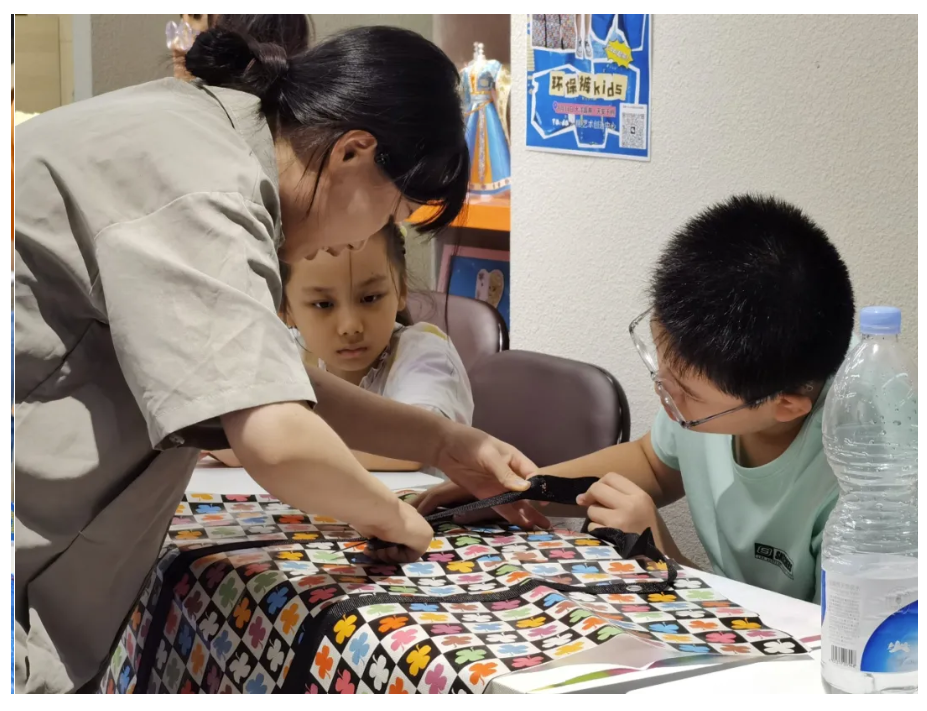 参观过后,少先队员开启了本次“艺术工作坊”体验:编织袋变废为宝、制作创意背带裤。少先队员与家长组队走进艺术工坊,指导老师在活动开始强调了环保的重要性,并展示了如何将废弃的编织袋,通过裁剪、缝合、装饰等步骤,摇身一变成为个性十足的背带裤。