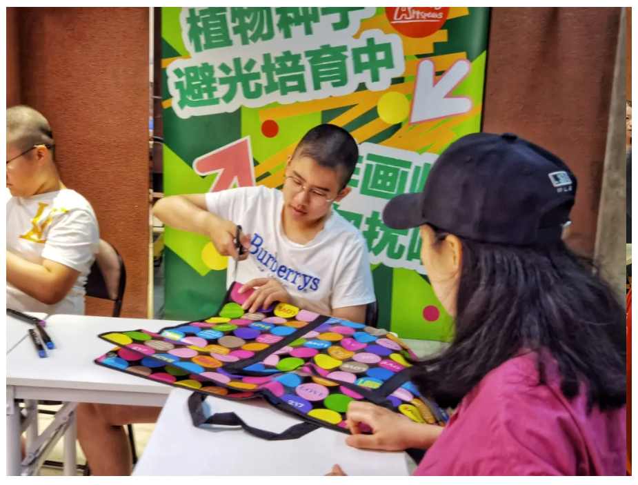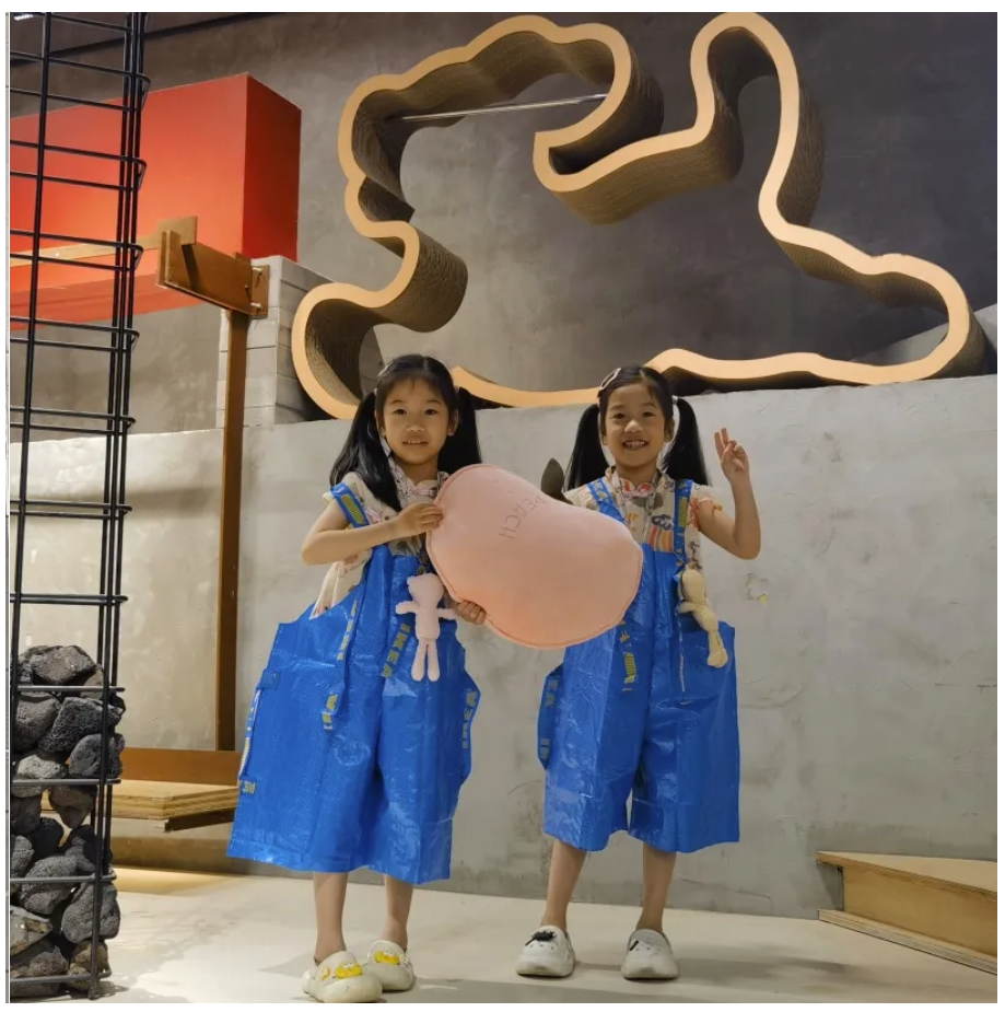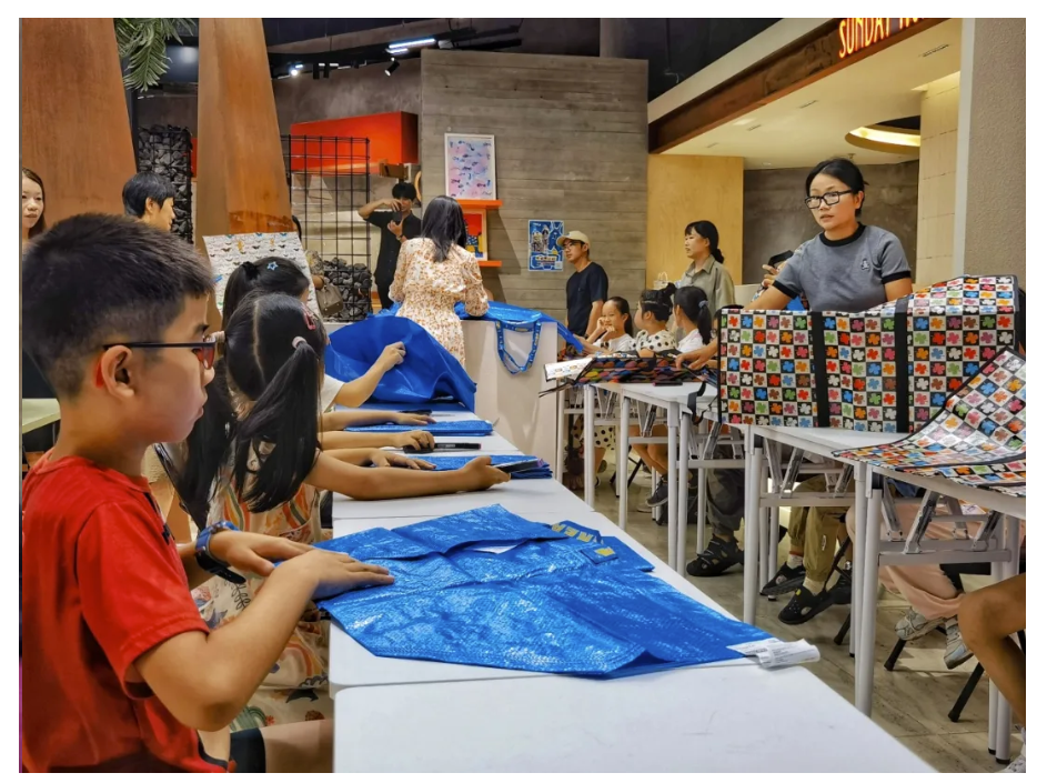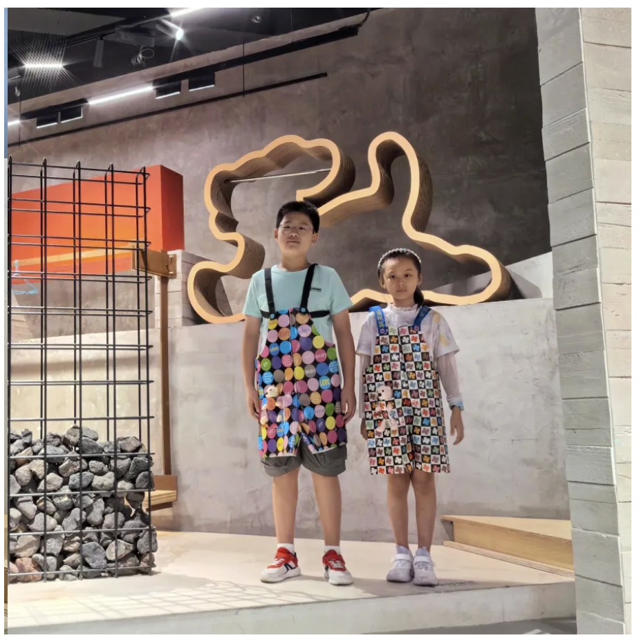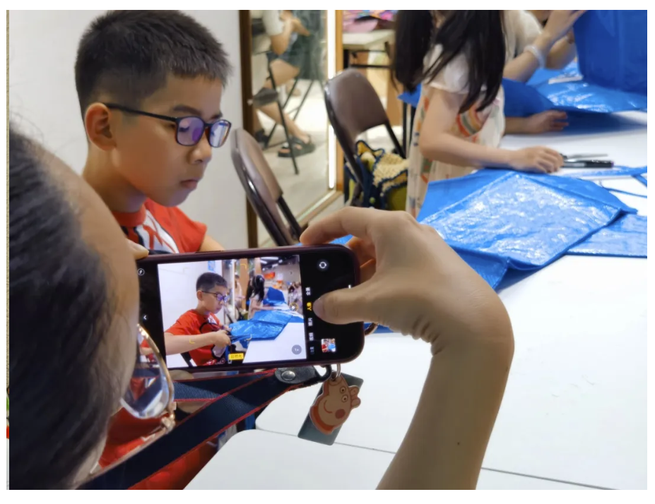 参观过后,少先队员开启了本次“艺术工作坊”体验:编织袋变废为宝、制作创意背带裤。少先队员与家长组队走进艺术工坊,指导老师在活动开始强调了环保的重要性,并展示了如何将废弃的编织袋,通过裁剪、缝合、装饰等步骤,摇身一变成为个性十足的背带裤。