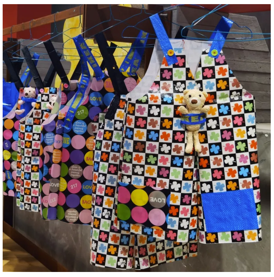 大家迅速行动起来,挑选自己喜欢的编织袋花色与图案,拿起剪刀和针线,开始了一场关于时尚的“编织革命”:从测量尺寸、裁剪布料,到缝制口袋、拼接裤腿,布置玩偶、纽扣等装饰“小巧思”,每一步都充满了挑战与乐趣,不同的创意灵感使得每一件作品都独一无二,充满了个人风格,将日常中不起眼的编织袋赋予了全新的生命。