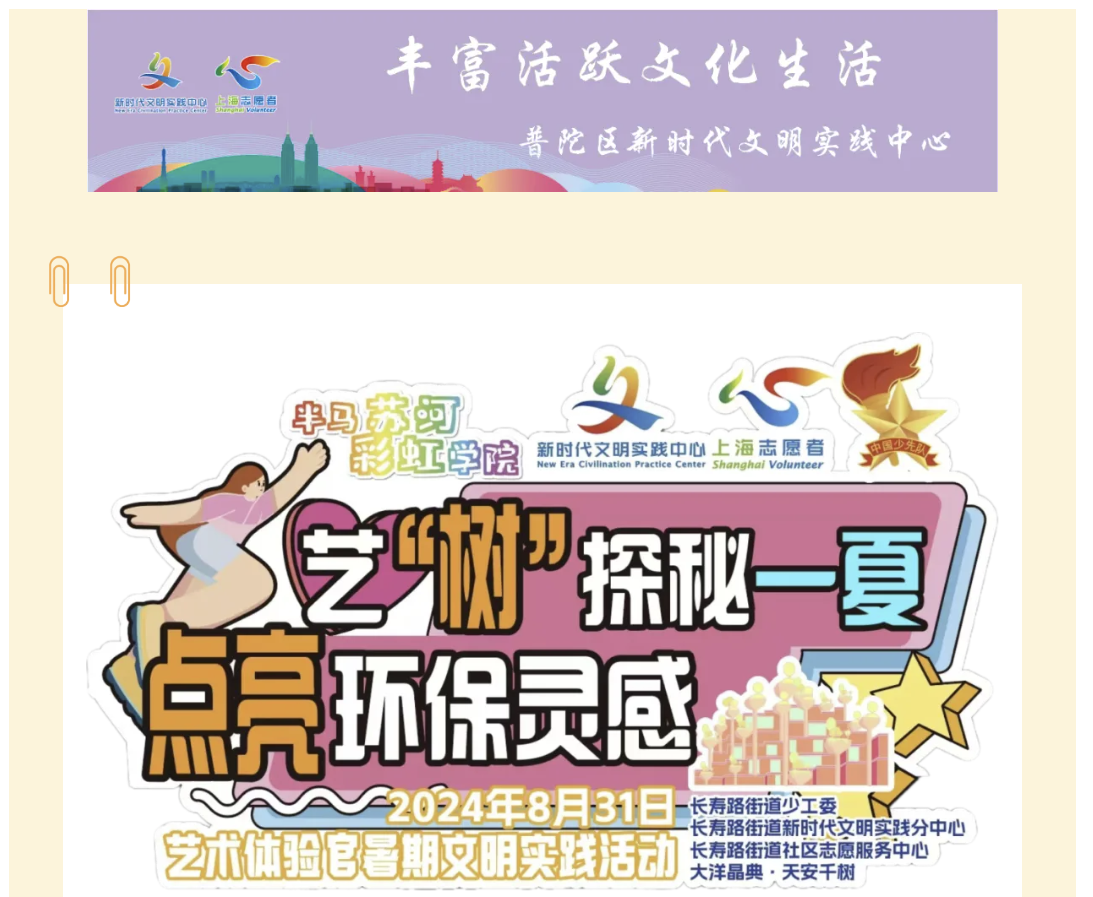 8月31日,长寿路街道少工委、长寿路街道新时代文明实践分中心、长寿路街道社区志愿服务中心联合大洋晶典•天安千树组织开展了长寿湾青年发展型街区第三期艺术研学营活动——“艺‘树’探秘一‘夏’,点亮环保灵感”红领巾艺术体验官文明实践活动,此次活动以艺术体验和环保创作为主题,吸引20组亲子家庭参与。