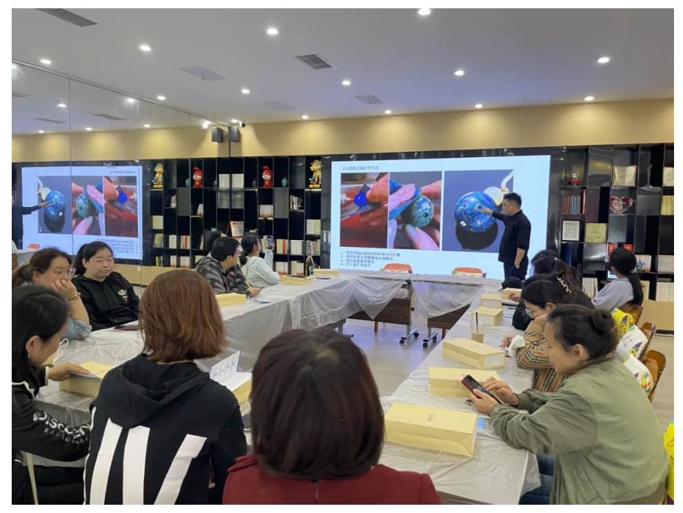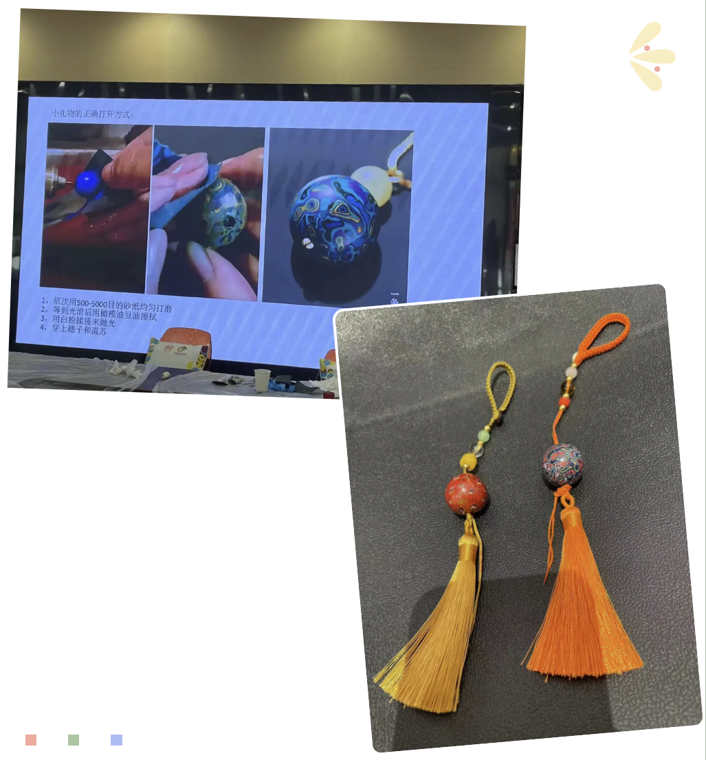 在李昌八老师的精心指导下,大家逐步掌握了制作技巧,一遍遍地打磨漆珠外层,直至其表面光滑如玉。每个人都全神贯注地投入到制作过程中,经过数十次的抛光后,一颗颗五彩斑斓的大漆珠终于完成。大家兴奋地展示自己的作品,活动现场洋溢着欢乐祥和的气氛。