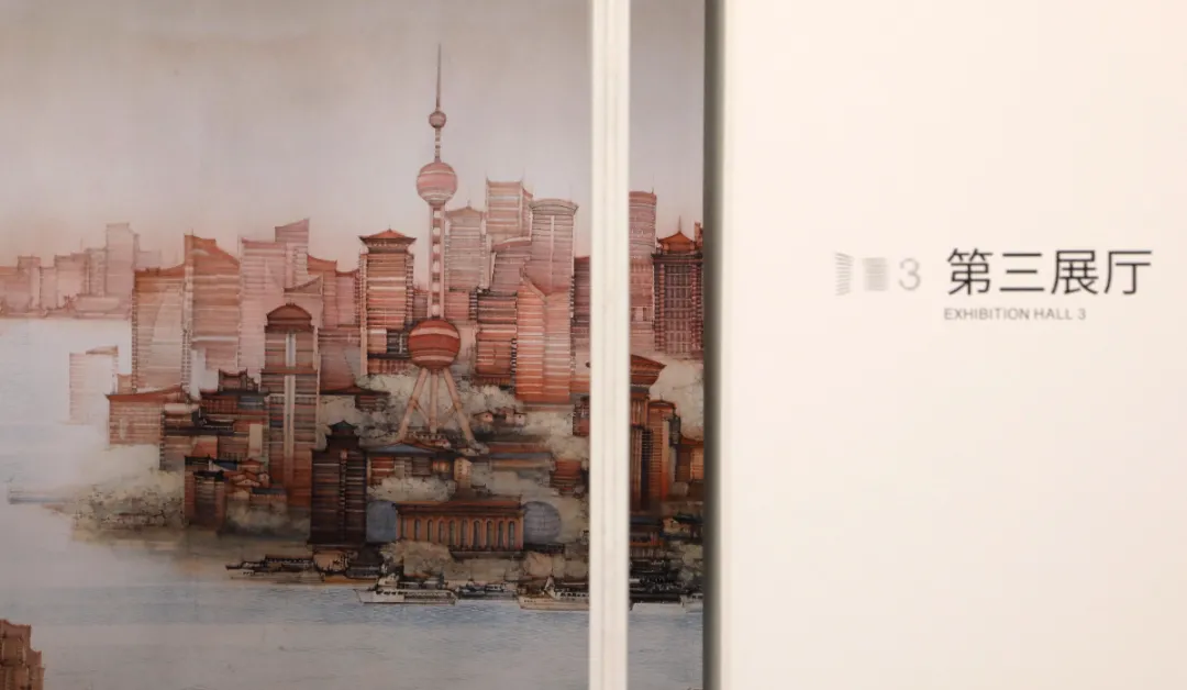 汪家芳是土生土长的上海普陀人,为本次展览,他历时三个月创作的《印象普陀》,是一幅宽达数米的城市水墨长卷。画中,长风公园的湖心亭、环球港的现代轮廓、真如寺的飞檐、泰来坊的石库门,以及江宁学校、上海造币厂的标志建筑、华东师范大学的门头……这些普陀地标并非物理意义上的真实排列,却以一种抒情的、蒙太奇式的手法共融于同一时空。