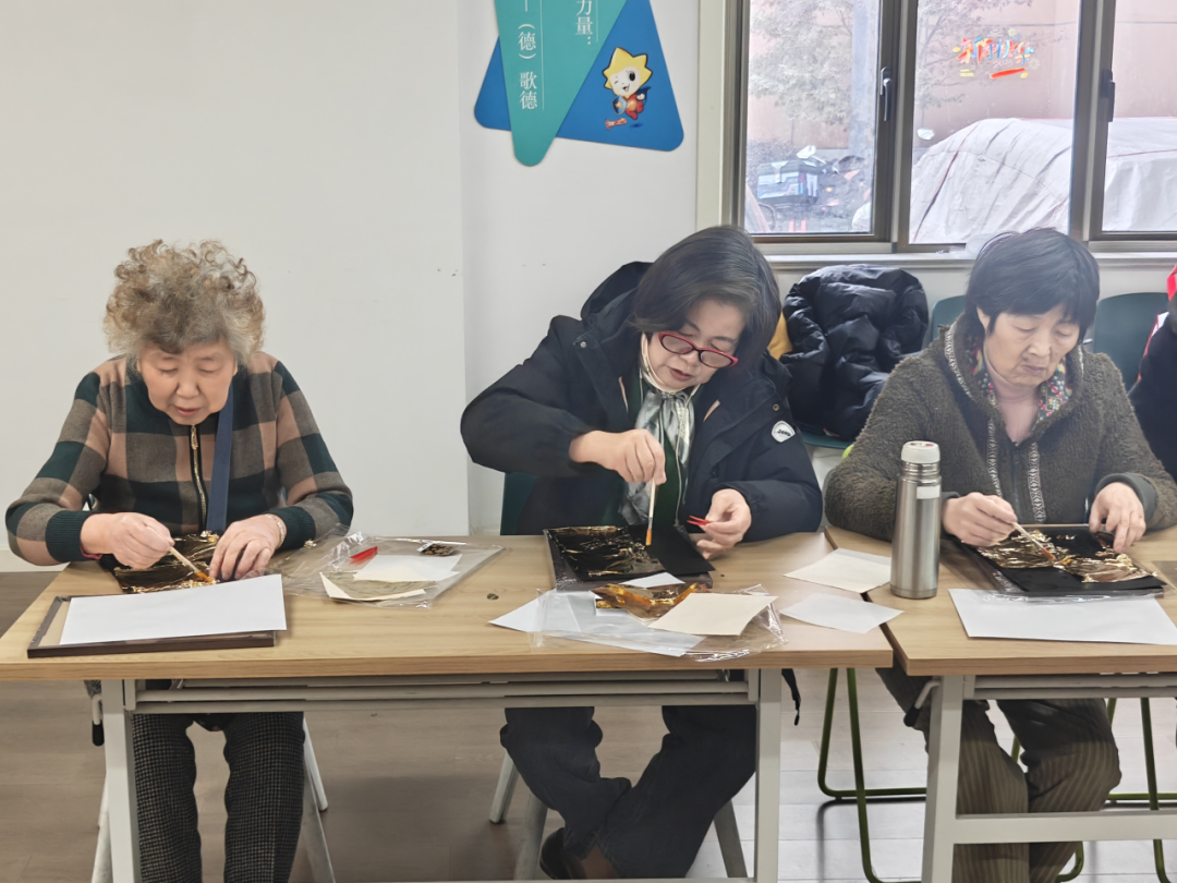 志愿老师简要讲解金箔画历史与制作要领后,老人们小心翼翼拈起薄如蝉翼的金箔,烟花、花鸟等主题的金箔画陆续成型。这场以非遗工艺为纽带的活动,不仅让长者感受传统艺术魅力,更在互帮互助中收获友谊,有居民直言:“动手又动脑,还能交新朋友,太有意义了!”