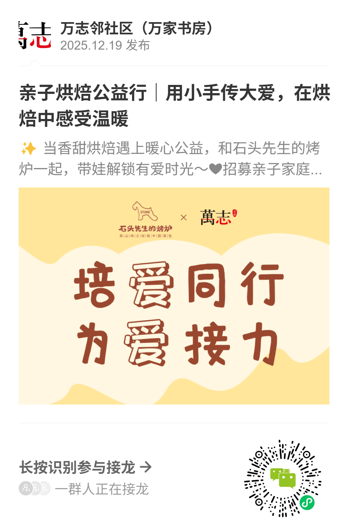 当香甜黄油遇上暖心公益,当亲子协作碰撞善意传递,一场充满温度的公益烘焙之旅在万里街道万家书房圆满开启!本次“焙爱同行 为爱接力”系列公益活动首站,由万志公益与石头先生的烤炉联合主办,活动吸引了12组亲子家庭热情参与。