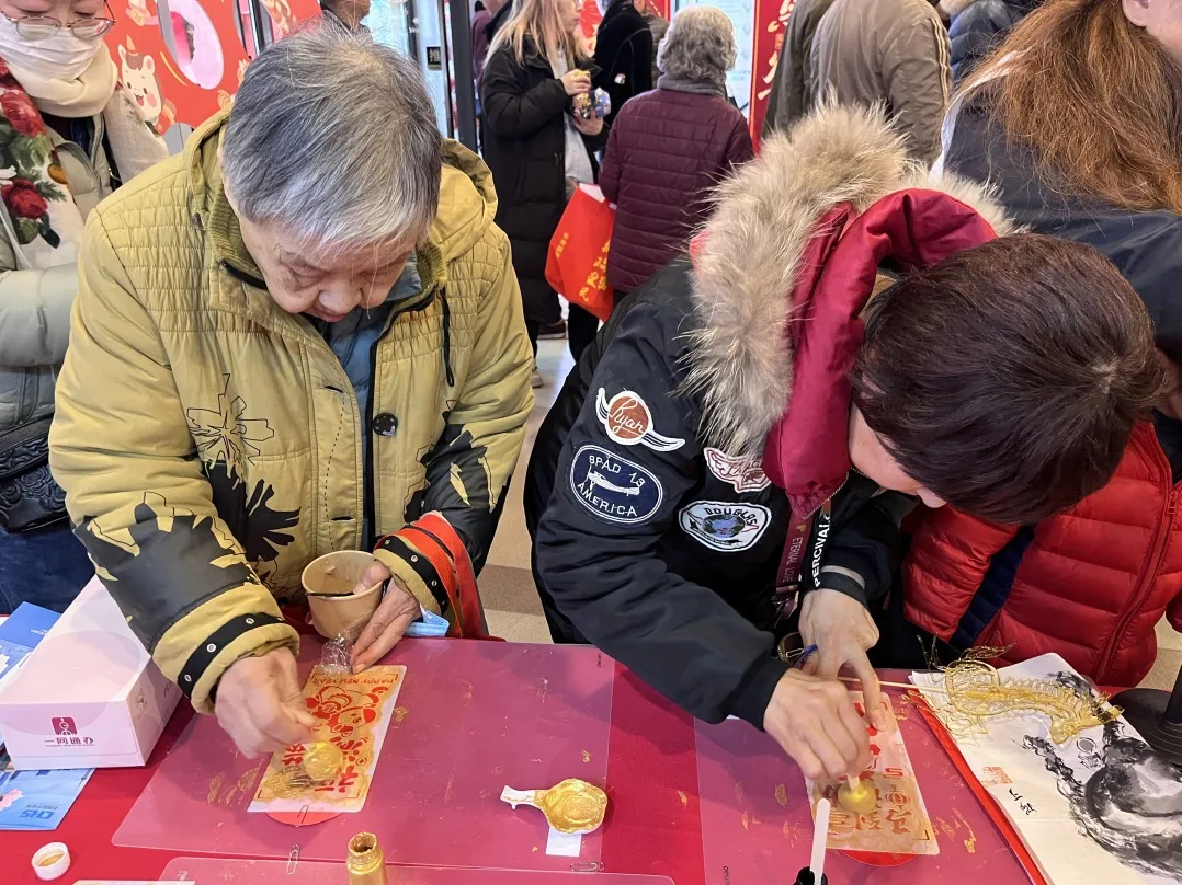 活动现场最引人注目的当属写福字摊位。来自社区学校书法沙龙的数位资深书法老师挥毫泼墨,笔锋流转间,一个个遒劲有力、风格各异的“福”字跃然纸上,每一笔每一划中都融入着对新年的美好祝愿。