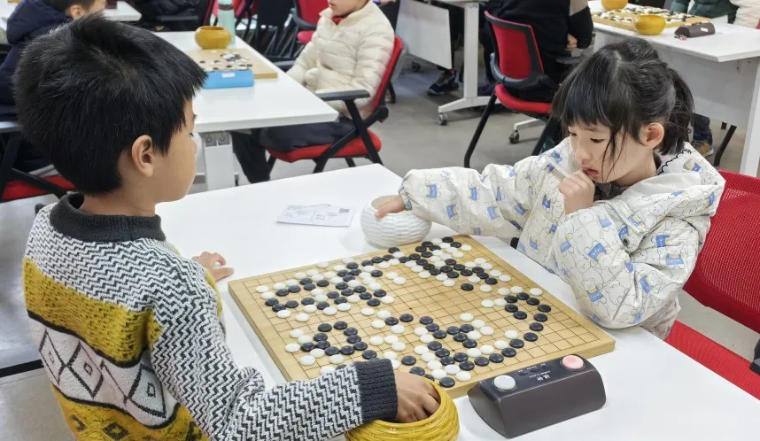 大年初七,少儿组赛事温情开赛。小小棋手们端坐棋盘前,沉着思考,从容落子,举手投足间尽显少年风采。