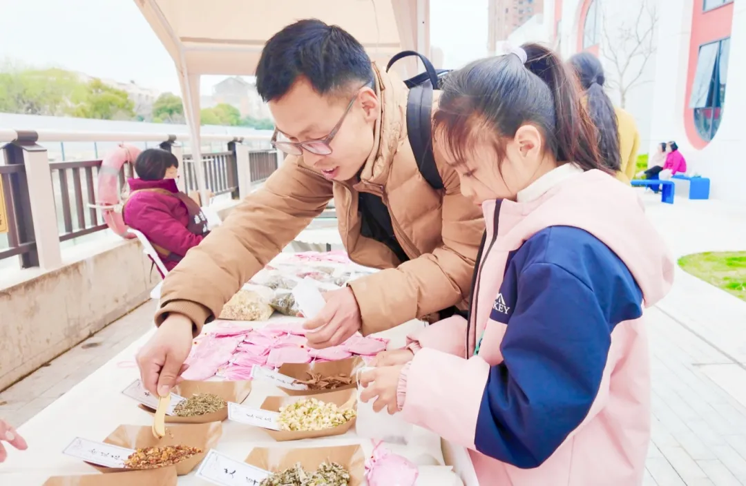 桃花香包制作区飘出淡淡的草本香气。12岁的潘迎雪和父亲一起亲手制作香囊,琳琅满目的干花品种多样,“我选了薰衣草、茉莉、橘皮,还有桃花,这和外面卖的不一样,是我自己亲手选的香味。”干花装囊,再用粉色桃花袋套上,精致又可人。