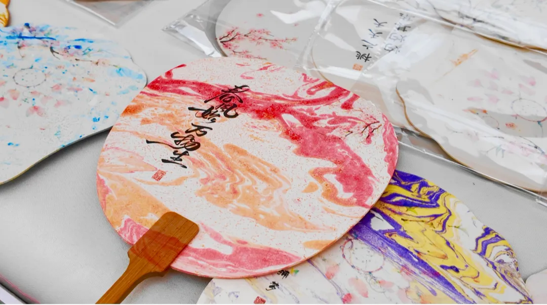 剪纸非遗传承人手把手教孩子们创作。一张红纸,几番折叠,一朵桃花便在孩子们手中盛开。糖浆在非遗传承人手中流转,手腕轻转,一朵晶莹的桃花便落在案板上。漆扇体验区里,市民们挑选写着“春风始万物生”的扇面,在滴上大漆的水面中轻轻一转,一面独一无二的扇子便成形了。