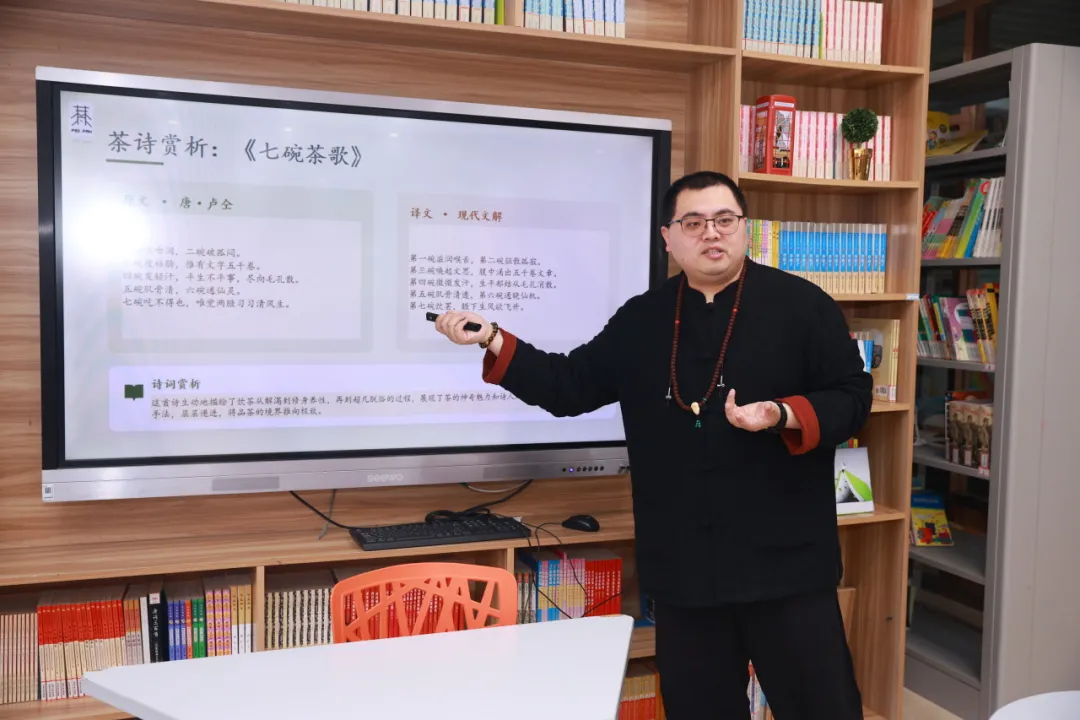讲座尾声,老师抑扬顿挫地诵读卢仝《七碗茶歌》“一碗喉吻润,二碗破孤闷……”边读边解读茶能解渴、解闷、舒心身的妙处。同时,又引出白居易《山泉煎茶有怀》,让同学们在诗句中体会古人煎茶的闲适心境。朗朗诗声回荡教室,同学们不仅领略了茶诗的文学魅力,还在互动环节踊跃提问:“明前龙井的‘明前’是什么意思?”“鸭屎香茶真的和鸭子有关吗?”在轻松愉悦的氛围中,大家认识了茶的起源、了解了六大茶类,也感受到了茶文化的深厚底蕴。