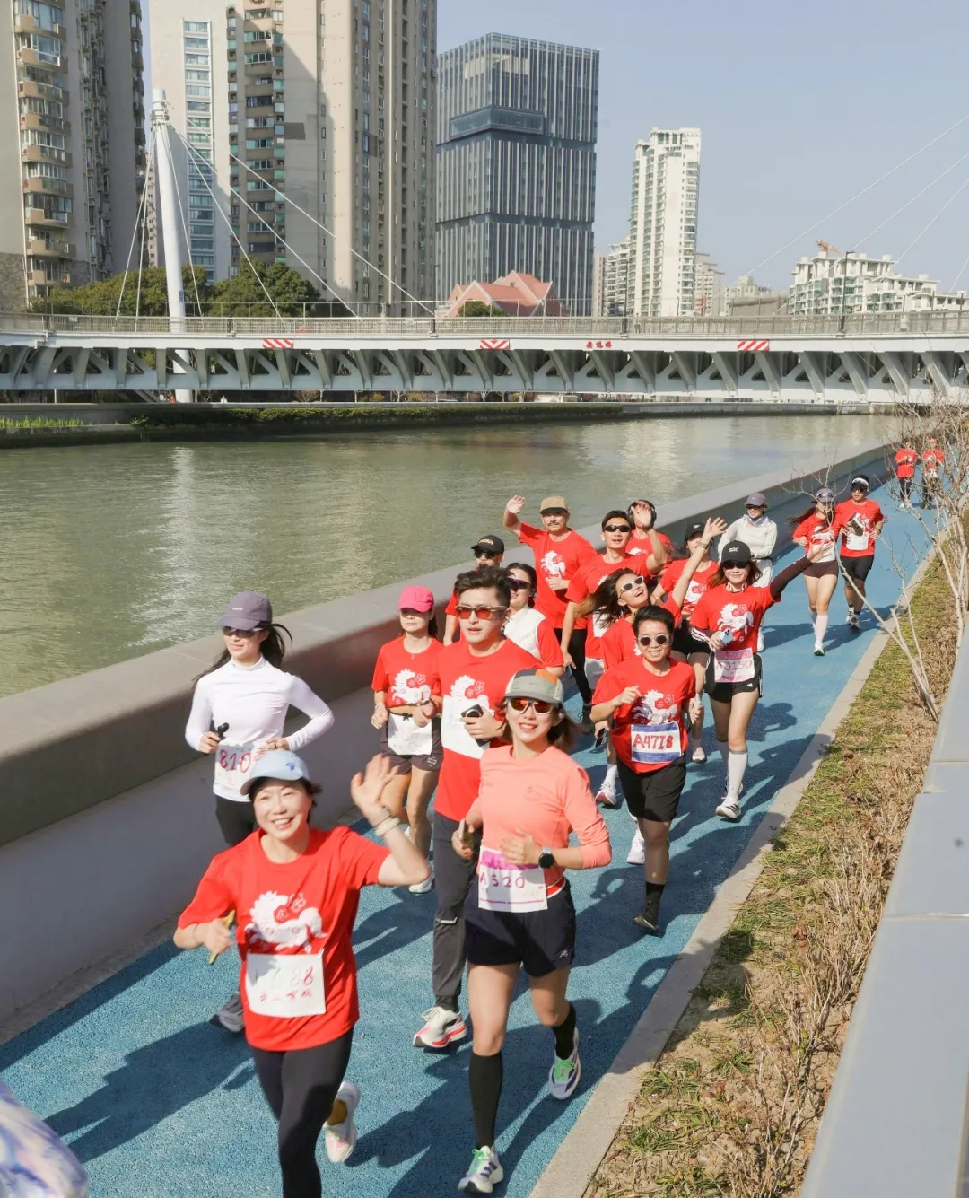 跑者符娜祯身着红色赛事T恤,脸上洋溢着喜悦:“今天天气非常好,沿河风景也特别好。穿上这身红色衣服特别喜庆,跑步时特别有氛围。新年希望自己能跑得更快、动起来更多,认识更多志同道合的朋友。”跑者钱卫敏则带着特别的“装备”前来:“2025年最新的热词是‘爱你老几’,我特意带了一个头纱来参加这个活动。从形式上更加爱自己一些,才能爱别人更多一些。希望新的一年能够跑出更健康的自己。”