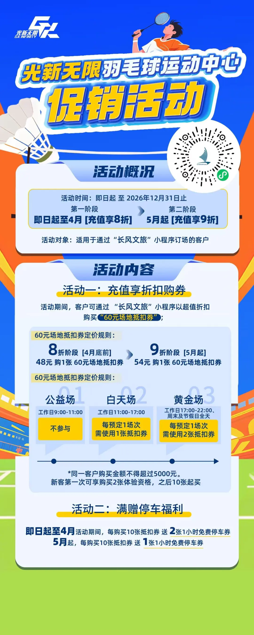 在羽毛球运动中心,场馆还推出了专属优惠与便捷服务。即日起至2026年12月31日,通过“长风文旅”小程序订场可体验充值享受折扣的优惠,最低可以48元购1张60元场地抵扣券,还有相应的满赠停车福利。相较于常规时段性价比拉满,切实为职工健身减负。此外,场馆还有专业教练可提供动作指导,运动新手也能快速上手。