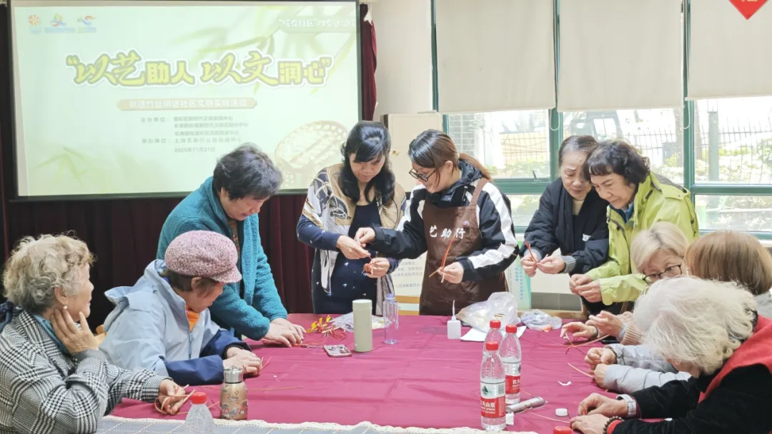 11月,长寿路街道新时代文明实践分中心携手上海艺助行公益促进中心,举办“以艺助人 以文润心”非遗竹丝编进社区活动。非遗传承人讲解示范竹丝编历史与竹风车编织技法,居民在志愿者一对一指导下专注创作,不久,精巧的竹风车陆续成型,大家手持成品分享展示,成就感满满。活动以非遗为纽带,让居民感受传统手工艺魅力,搭建邻里交流平台,推动文明实践在基层落地。