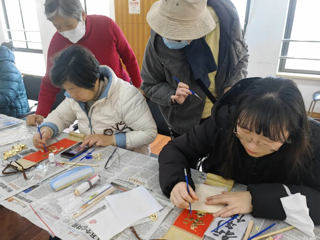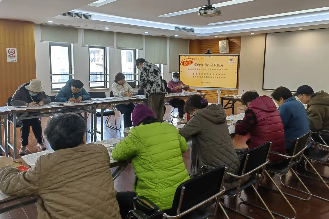 活动刚开场,非遗老师举起一片金箔:“这是非遗‘金箔贴字’,是传承千年的‘指尖功夫’!”在非遗老师的带领下,居民们围坐桌前,手执细镊,屏息凝神,将薄如蝉翼的金箔轻轻贴上朱砂红宣纸。一个“福”字,一匹“骏马”,一笔一划间,寄托着对新岁的祈愿。