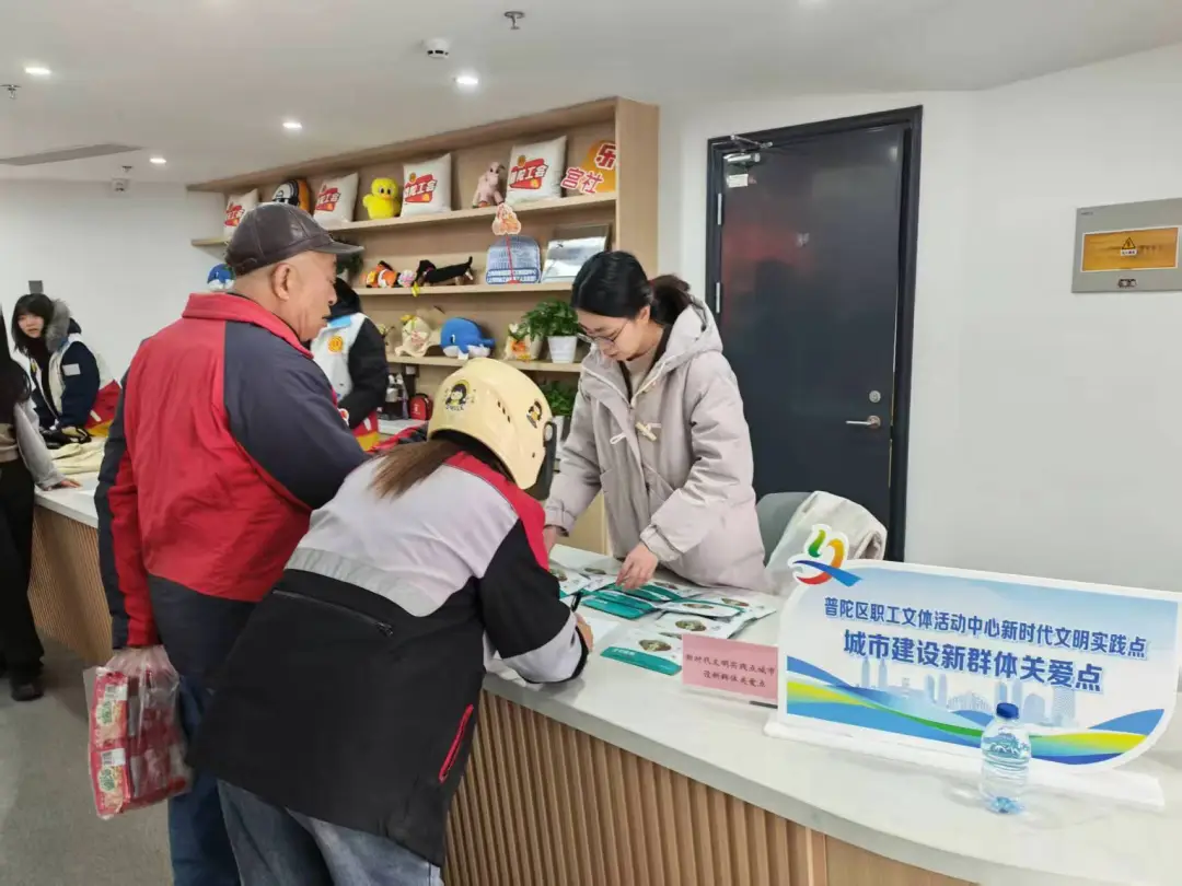 为切实增强城市建设新群体的归属感与幸福感,普陀区新时代文明实践中心依托长风湾苏河驿站、近铁e站、普陀区职工文体活动中心3个“城市建设新群体关爱点”,开展“冬日暖阳·新就业群体关爱行动”,为奔波在一线的新就业群体与户外劳动者送上冬日里的温暖与新年祝福。