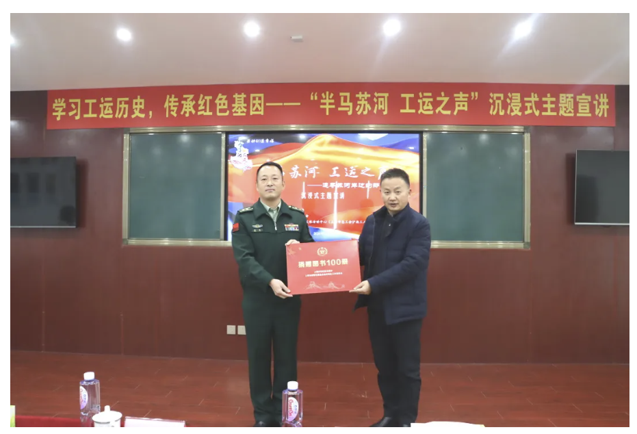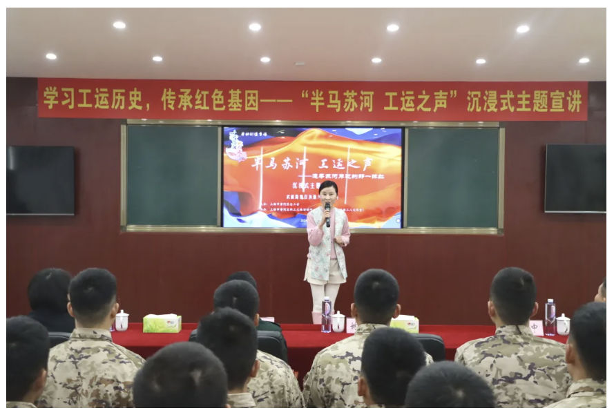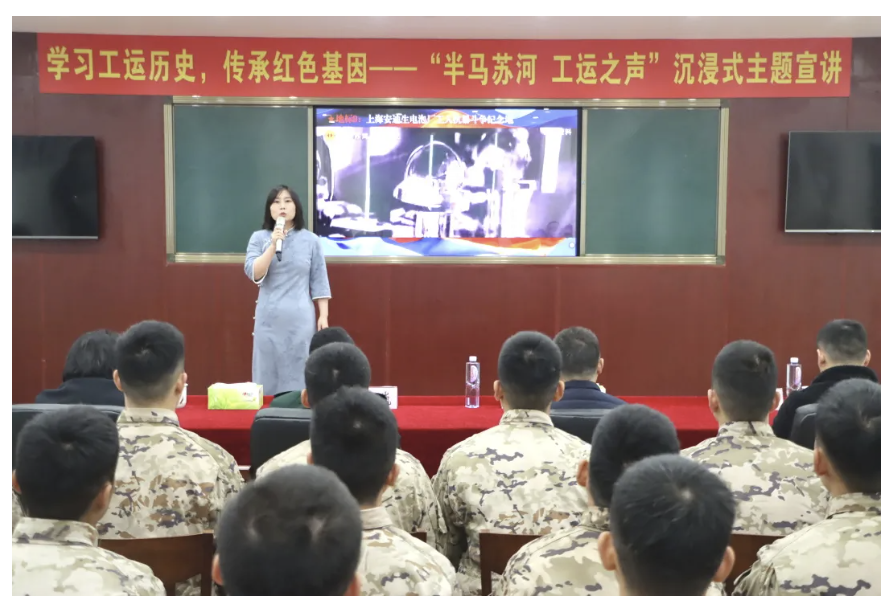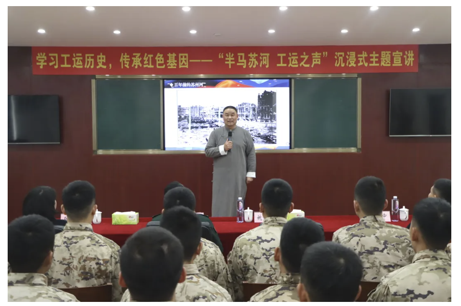 宣讲团成员用一张百年前的苏州河老照片、一首《工人生活歌》和一张手绘地图,将苏河两岸的红色历史地标连点成线,带领官兵溯觅工运之源,体悟工运的不朽精神。深情有力的讲解,将彪炳史册的中国工人运动历史事件以及佘立亚、蔡和森和杨开慧等革命先驱可歌可泣的故事为大家徐徐道来,让在场部队官兵切身感受到了沪西工人运动跨越百年的红色气息,真切体悟到刘华等烈士为了民族独立和解放,在沪西为中国工运事业不懈奋斗,直至献出宝贵生命的英勇事迹和无私奉献的精神。