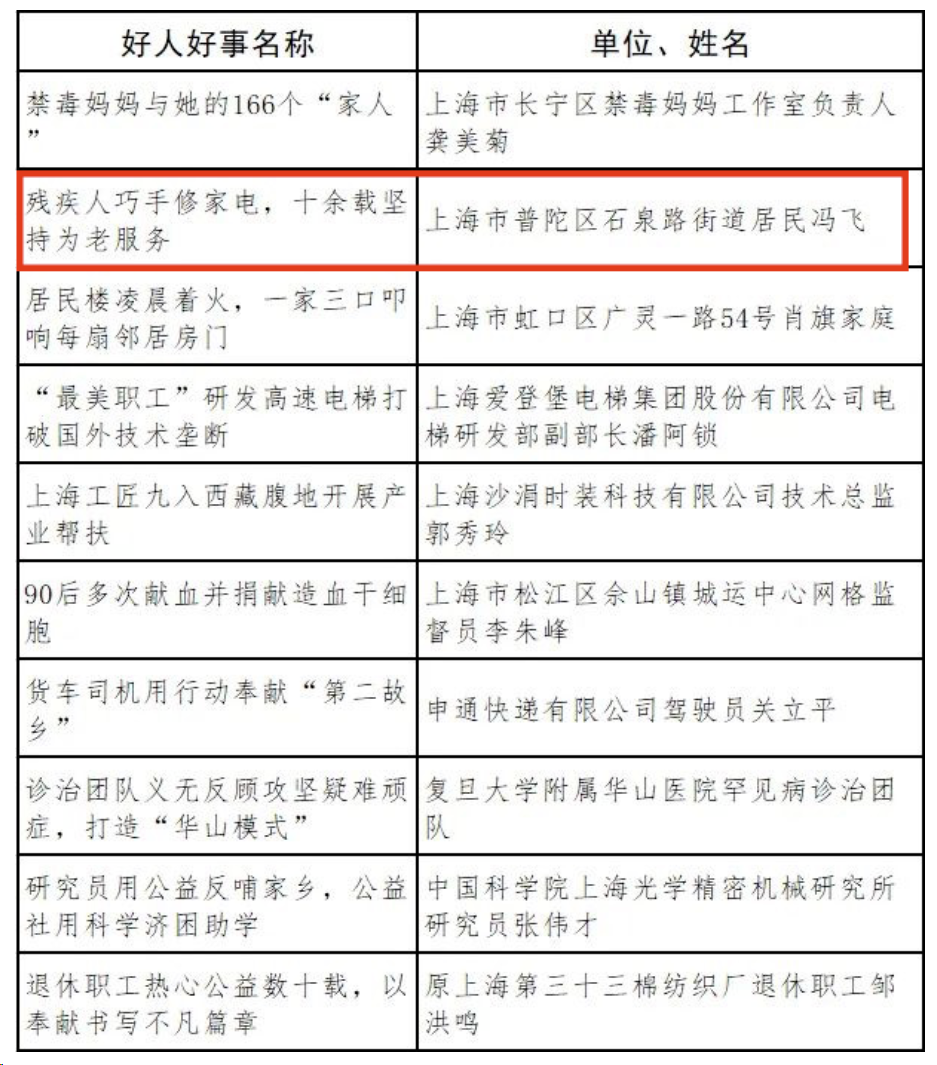 冯飞患有肢体残疾,但他身残志不残,自强不息,自主创业,成立了“冯飞家电维修部”;他乐于助人,热心公益,3.5和12.5活动志愿服务从不缺席。一直坚持自己的信念和理想,践行公益和志愿者精神,默默付出,回报社会;他“为人正直、待人谦和”,无论是三九严寒,还是高温酷暑,无论空调损坏,还是线路故障,只要社区里的老人需要,他随叫随到。他就是上海市普陀区石泉路街道居民——冯师傅。