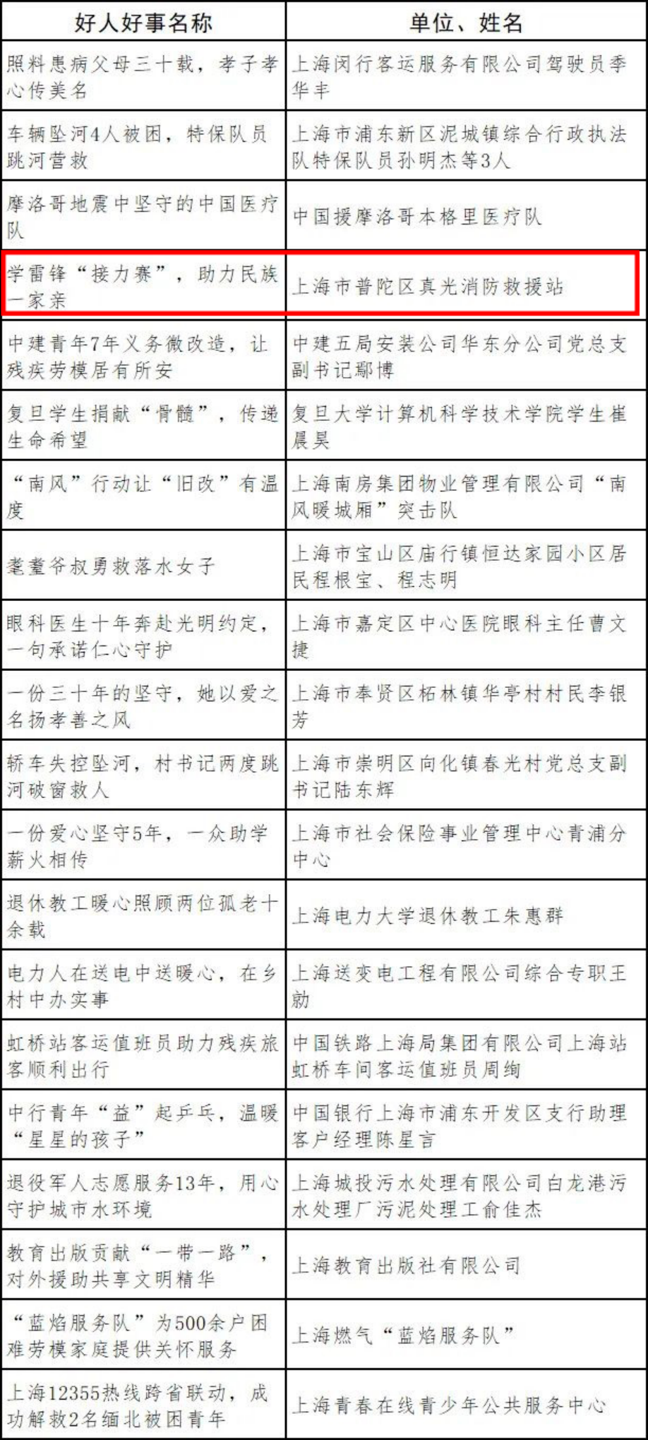近日,2023年度上海市社会主义精神文明好人好事发布。经评审评议、社会公示等环节,普陀区推荐的“残疾人巧手修家电,十余载坚持为老服务”(上海市普陀区石泉路街道居民冯飞)获评2023年度上海市社会主义精神文明好人好事,“学雷锋‘接力赛’,助力民族一家亲”(上海市普陀区真光消防救援站)获评2023年度上海市社会主义精神文明好人好事提名。