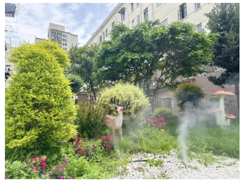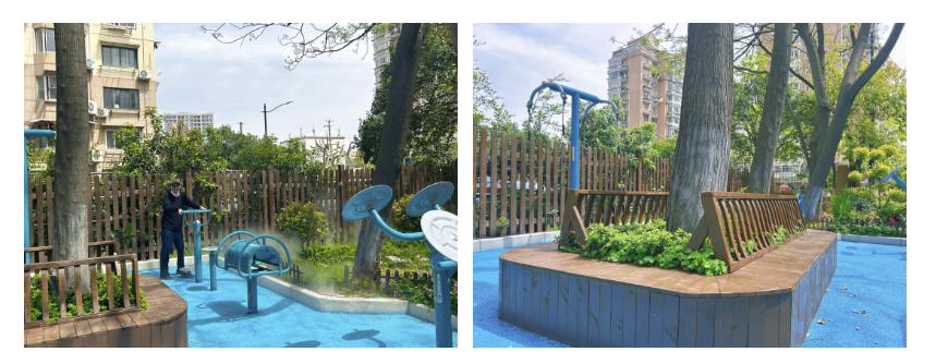 历经前后4次调整设计方案后,如今小区益智健身点的功能得到重新布局设计,不再紧邻马路,并新增了雾化系统起到降尘、灌溉及夏日降温作用,美观度上也得到了提升。