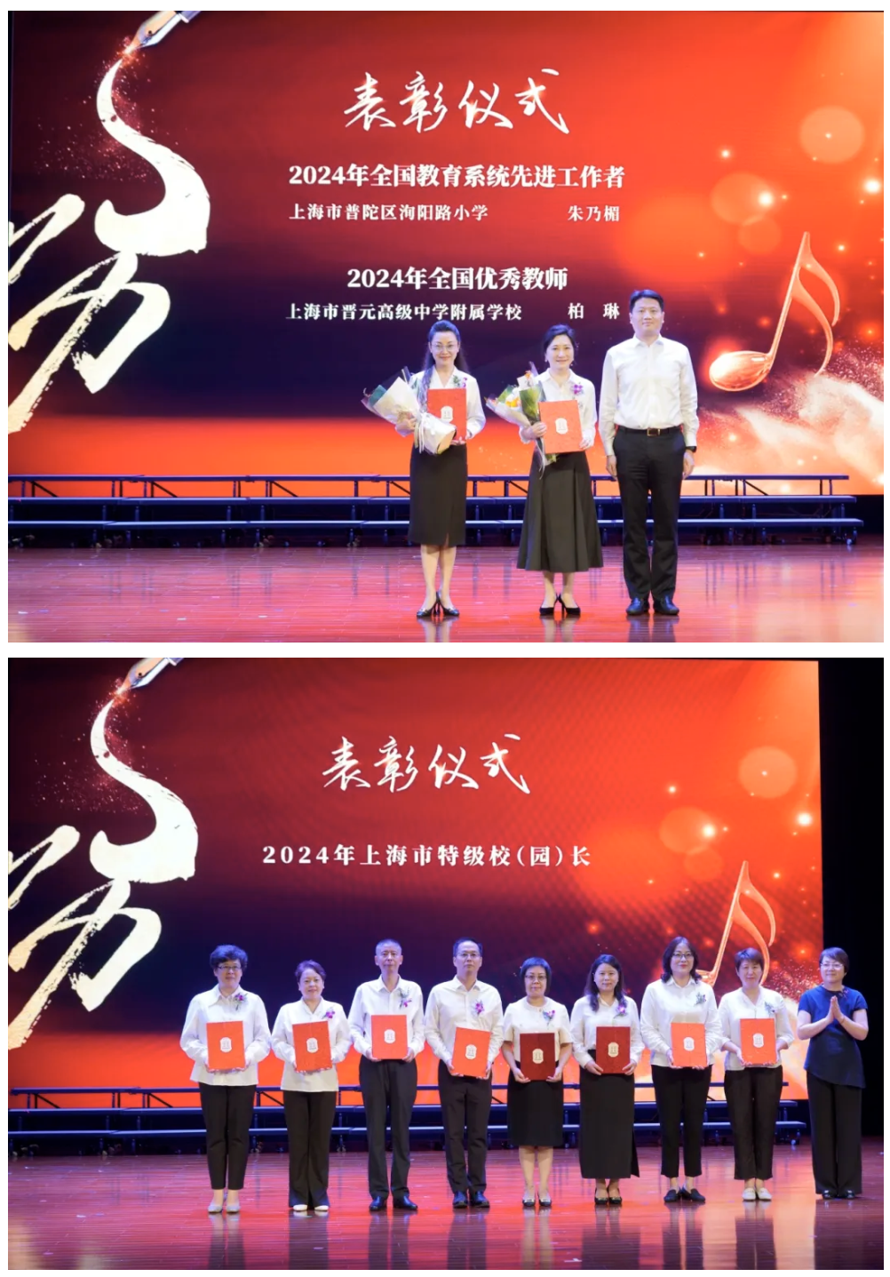 “十四五”期间,普陀不断推进高水平高质量教育现代化和教育强区建设,一批优秀教师走上了全市和国家平台,充分展现了普陀教育的硬核实力。活动现场表彰了2024年全国教育系统先进工作者、全国模范教师、2024年上海市特级校(园)长、2023年上海市正高级教师代表、2024年市园丁代表及市五一劳动奖章获得者等一批先进教师典型,激励广大教育工作者弘扬践行教育家精神,切实担负起建设教育强国的责任使命。