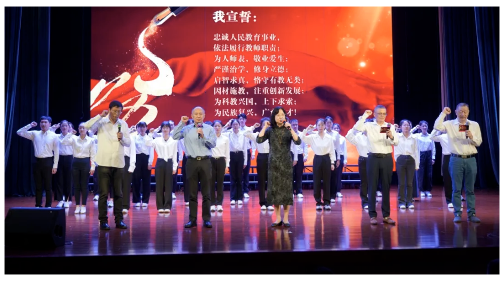 青丝白发,见证悠悠岁月;韶华咫尺,无悔使命初心。五位深耕普陀教坛四十载的荣休老教师代表也来到了活动现场,他们都是正高级教师、上海市特级教师,把全部的青春力量献给了教育事业。他们深情回顾了自己的从教经历,分享了各自的教育理念。师道传承,匠心育人。今年,又一批新教师加入了普陀教育大家庭,接过教育事业的接力棒,大会现场,老教师们带领新教师代表进行了入职宣誓。