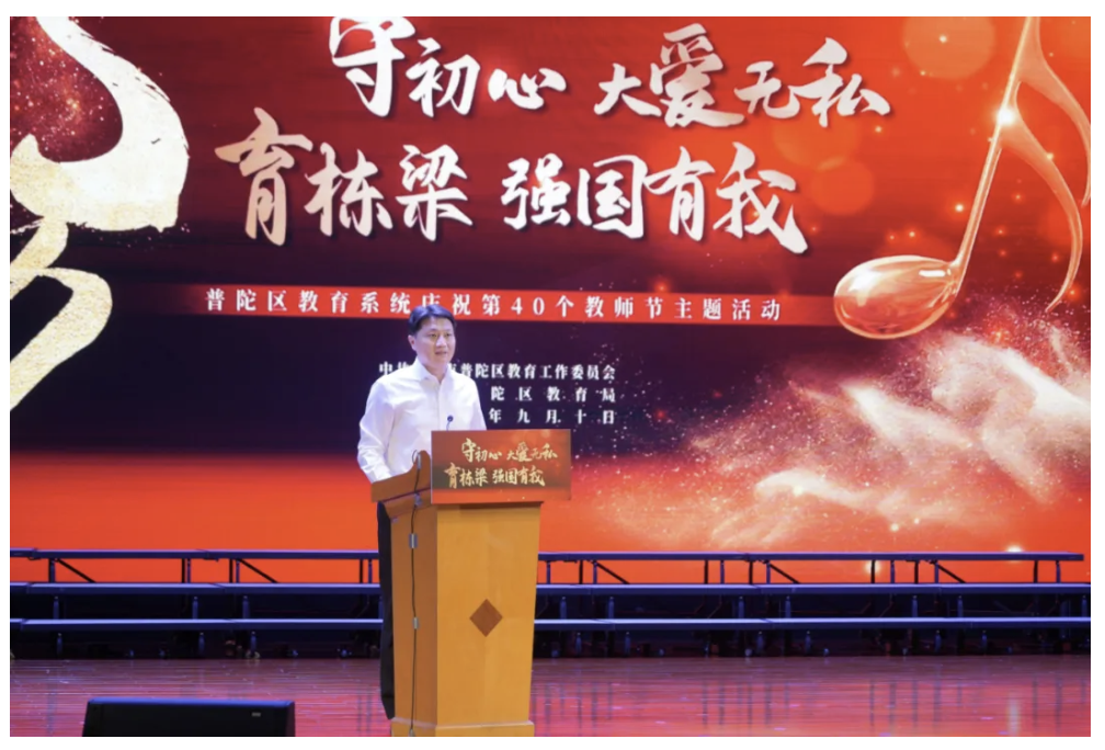 姜冬冬代表区四套班子,向全区广大教师和教育工作者致以节日问候,向受到表彰的先进个人表示热烈祝贺。他充分肯定了区教育系统在近年来取得的成绩,希望全区广大教师坚持初心向党、悉心育人、潜心治学,做有志之师、有才之师、有德之师,以更加奋发有为的良好姿态,扛起普陀教育高质量发展的千钧重担。他表示,区教育系统要找准教育改革创新的切入点,持续扩大优质服务供给,优化教育资源布局。区委、区政府将以更大力度落实惠师政策、提供暖师服务、推进强师举措、营造尊师氛围,以教育事业的“高分答卷”迎接新中国成立75周年。