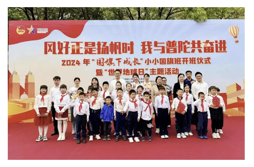 4月20日,小小国旗班的少先队员们执行升旗任务。团区委发布《2024年“国旗下成长”普陀区青少年升国旗暨爱国宣讲主题活动实施方案》。建管委青年代表与少先队员代表共同宣读《环保倡议》。随后,与会领导为少先队员们颁发了小水滴志愿者徽章,并一同参与了消防普陀支队桃浦特勤站的参观与体验活动。