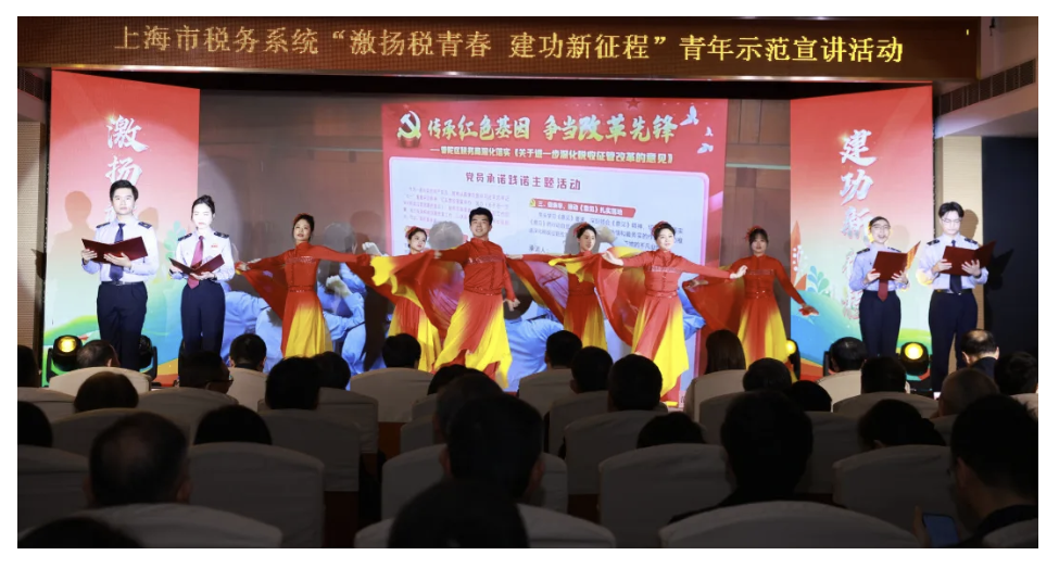 4月28日上午,普陀区税务局协助上海市税务局承办“激扬税青春 建功新征程”青年示范宣讲活动。由普陀税务青年选送的朗诵歌舞节目《清澈的爱,只为中国》作为开场表演,将活动现场气氛点燃。优美的舞蹈展现了普陀税务青年的昂扬向上的精神风貌,高水平演出获得观众阵阵掌声。
