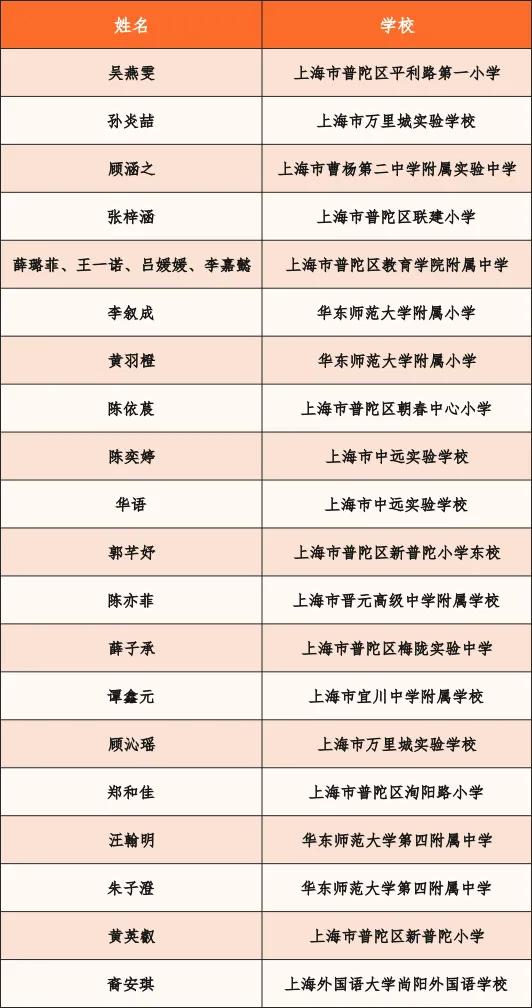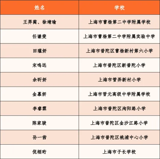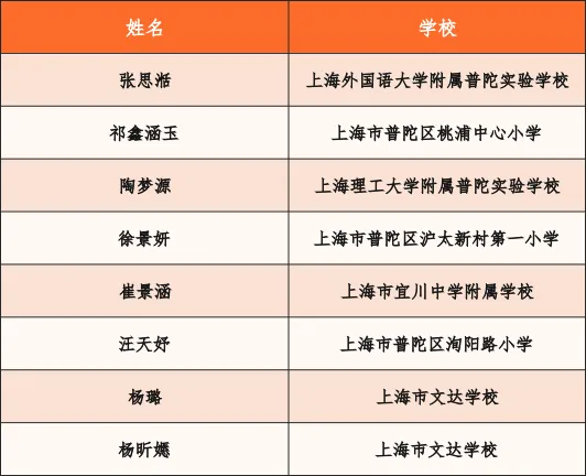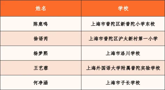 上海市子长学校何净涵荣获市级一等奖,上海市普陀区新普陀小学东校陈鹿鸣荣获市级二等奖,上海外国语大学附属普陀实验学校王艺蓉、上海市洛川学校杨梦熙、上海市普陀区沪太新村第一小学徐语芮荣获市级三等奖。