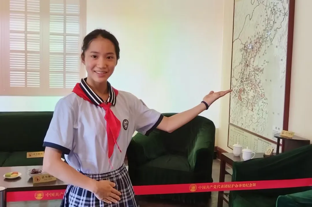 何净涵心怀对红色文化的炽热深情,阅读红色经典、了解先辈故事,主动肩负起红领巾讲解员的使命。她从初次讲解时的青涩紧张,到如今的游刃有余。在周公馆担任小小讲解员的经历,更是让她深刻领悟到讲解员工作所承载的厚重意义——不仅是传递历史知识,更是传承红色基因、唤醒初心使命。每一次讲述,既是对历史的致敬,也是对自我的教育。