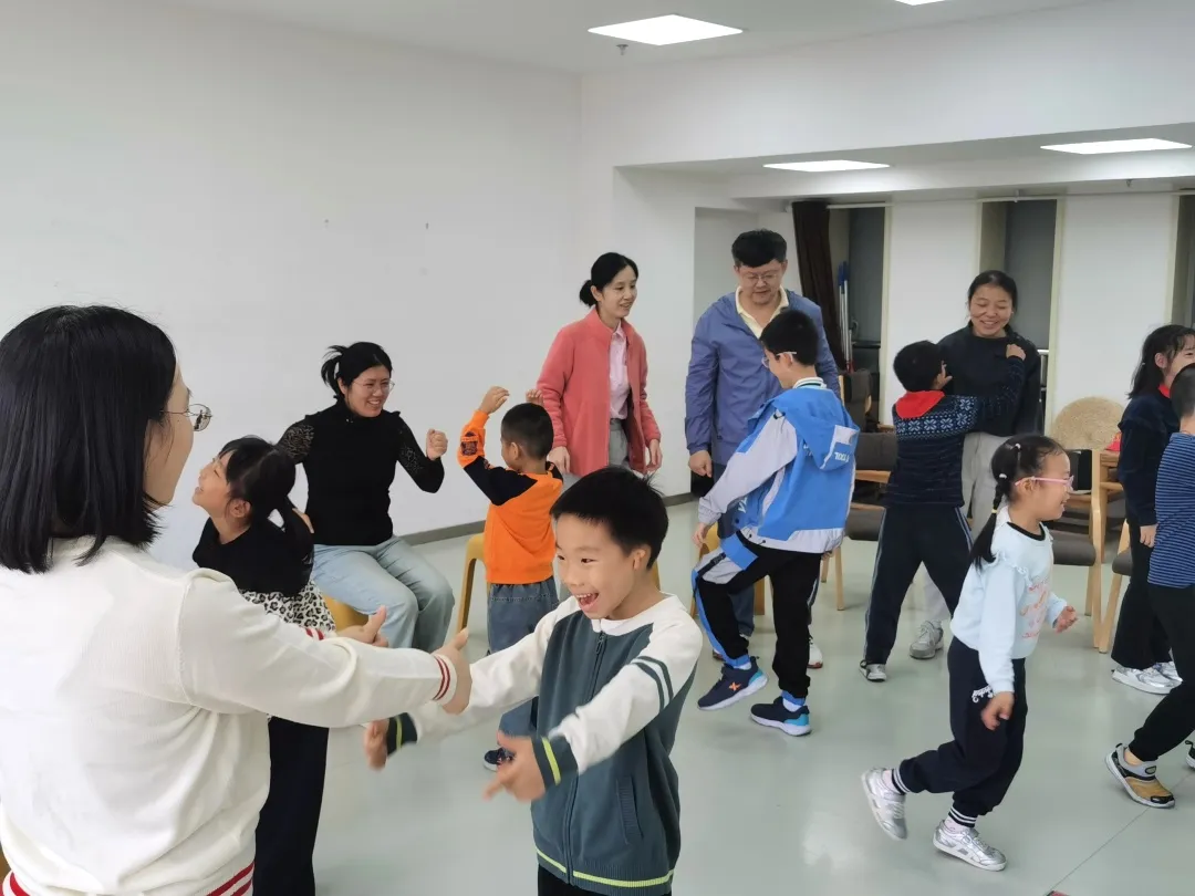 音乐舞动环节,在老师的带领下,大家通过肢体互动分别体验了相互合作与相互理解的感受。“指尖探索”中,大家跟随老师提出的部位紧紧相靠,从“肩膀和后脑勺”的两人一组合作到“鼻子、耳朵和膝盖”的三人一组合作,再到孩子们自己出题,随着游戏的复杂化,大家对相互合作有了更深的理解。