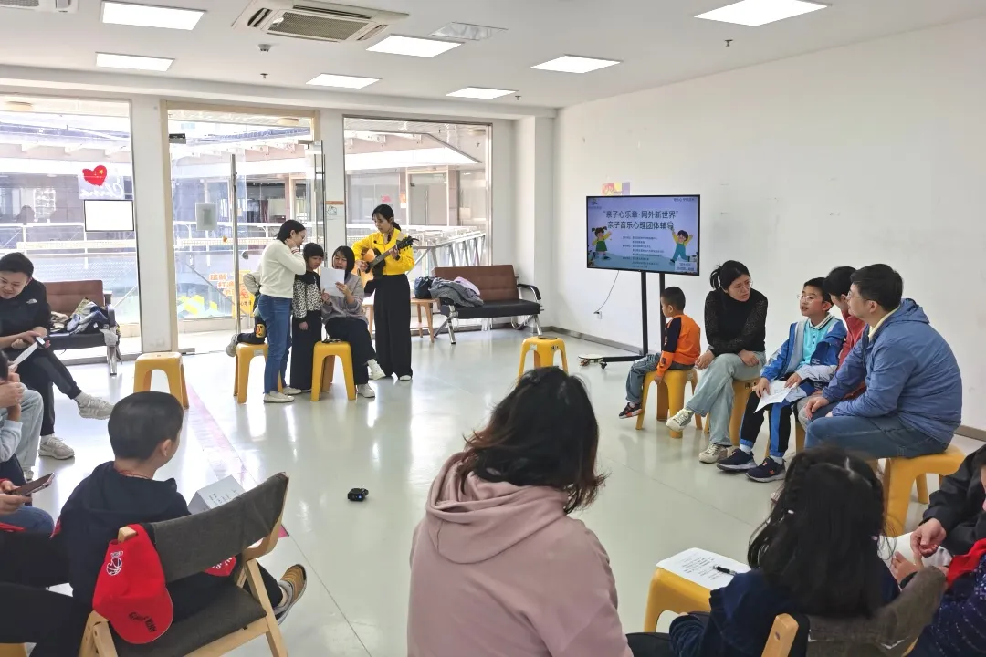活动伊始,老师一边拨动吉他一边组织互动,随后带着大家一边拍手一边自我介绍。伴随掌声节奏,亲子家庭的每名成员轮流重复说出名字。一圈下来,大家互相建立起初步联结。