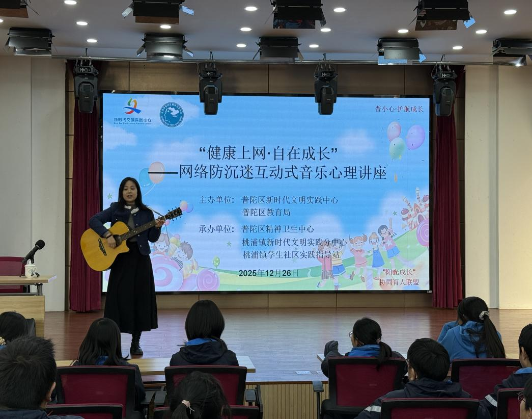 近日,依托普陀区“阳光成长”协同育人联盟平台,由普陀区新时代文明实践中心、普陀区教育局主办,普陀区精神卫生中心、桃浦镇新时代文明实践分中心、桃浦镇学生社区实践指导站承办、上海外国语大学尚阳外国语学校协办的普陀区“普小心·护航成长计划”暨“健康上网・自在成长” 音乐心理讲座活动顺利举行,上海外国语大学尚阳外国语学校7年级百余名学生参与其中。活动以音乐为桥、创作为媒,助力同学们觉察情绪需求,感受线下生活美好,注入健康上网与自在成长的内在力量。