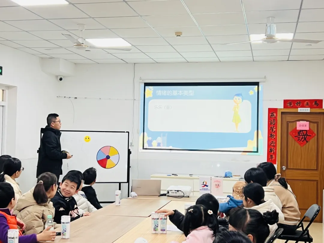 课程伊始,授课老师邹博士以动画电影经典角色为引,生动拆解了喜、怒、哀、惧、厌五种基本情绪。从“情绪大转盘”的趣味互动,到“我的情绪树”创作环节,孩子们不再模糊地感知心情,而是拿起贴纸,用红、绿、蓝等色彩具象化表达:“红色让我感受到愤怒,因为……”。通过这一环节,孩子们第一次清晰地辨认并命名了内心的“情绪小怪兽”,明白了情绪没有好坏之分,它们都是我们心理状态的真实反映。